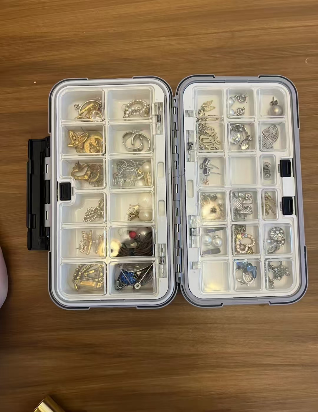 这种鱼线盒内部有很多个独立的小格子,还有盖子,用来放首饰再合适不过了,不用担心项链手链和戒指缠绕到一起,也不用担心银饰会氧化。小小的盒子直接放到抽屉里或者梳妆台上也不占地方。