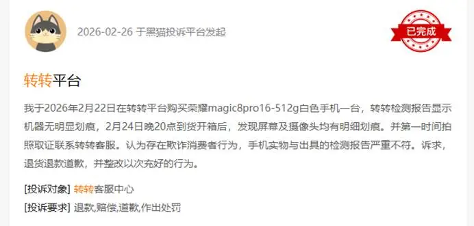 黑猫投诉平台上有用户投诉说,我于2026年2月22日在转转平台购买荣耀magic8pro16-512g白色手机一台,转转检测报告显示机器无明显划痕,到货开箱后,发现屏幕及摄像头均有划痕。