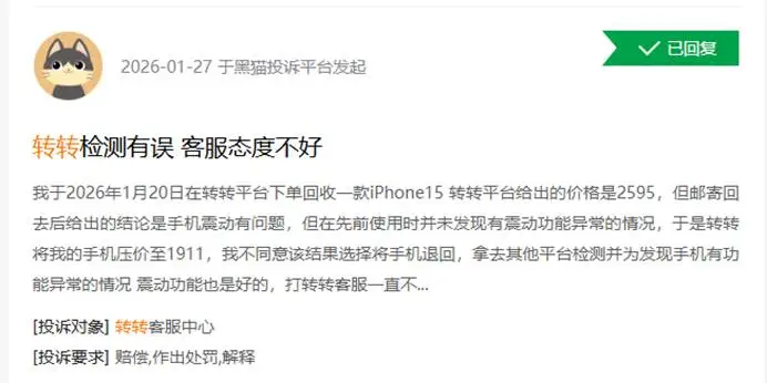 比如,有一位用户投诉:我在2026年1月20日通过转转平台下单回收了一台iPhone15,转转平台给出的价格是2595元。但是邮寄回去之后,给出的结果是手机震动有问题,但是之前使用的时候并没有发现有震动功能异常的情况,于是转转把我的手机压到了1911元,我不认可这个结果,选择把手机退回去。