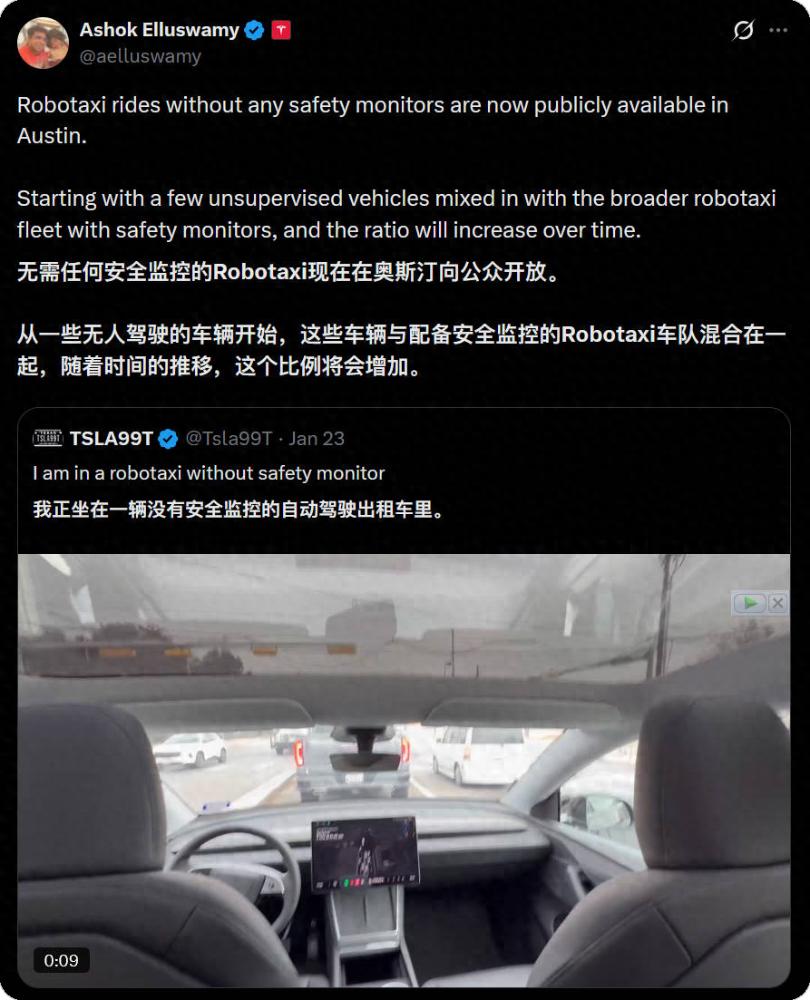 2026 年 1 月 22 日,特斯拉在美国得克萨斯奥斯汀推出了无人值守的 Robotaxi 服务——车上没有司机、没有安全监督员,只有乘客。随后特斯拉 AI 主管 Ashok Elluswamy 在社交媒体宣布,这是「少数无人监督车辆混在有安全监督员的车队中,比例会逐渐提高」。马斯克在达沃斯论坛上也表示,2026 年底之前特斯拉 Robotaxi 将在美国「非常、非常广泛」地部署。
