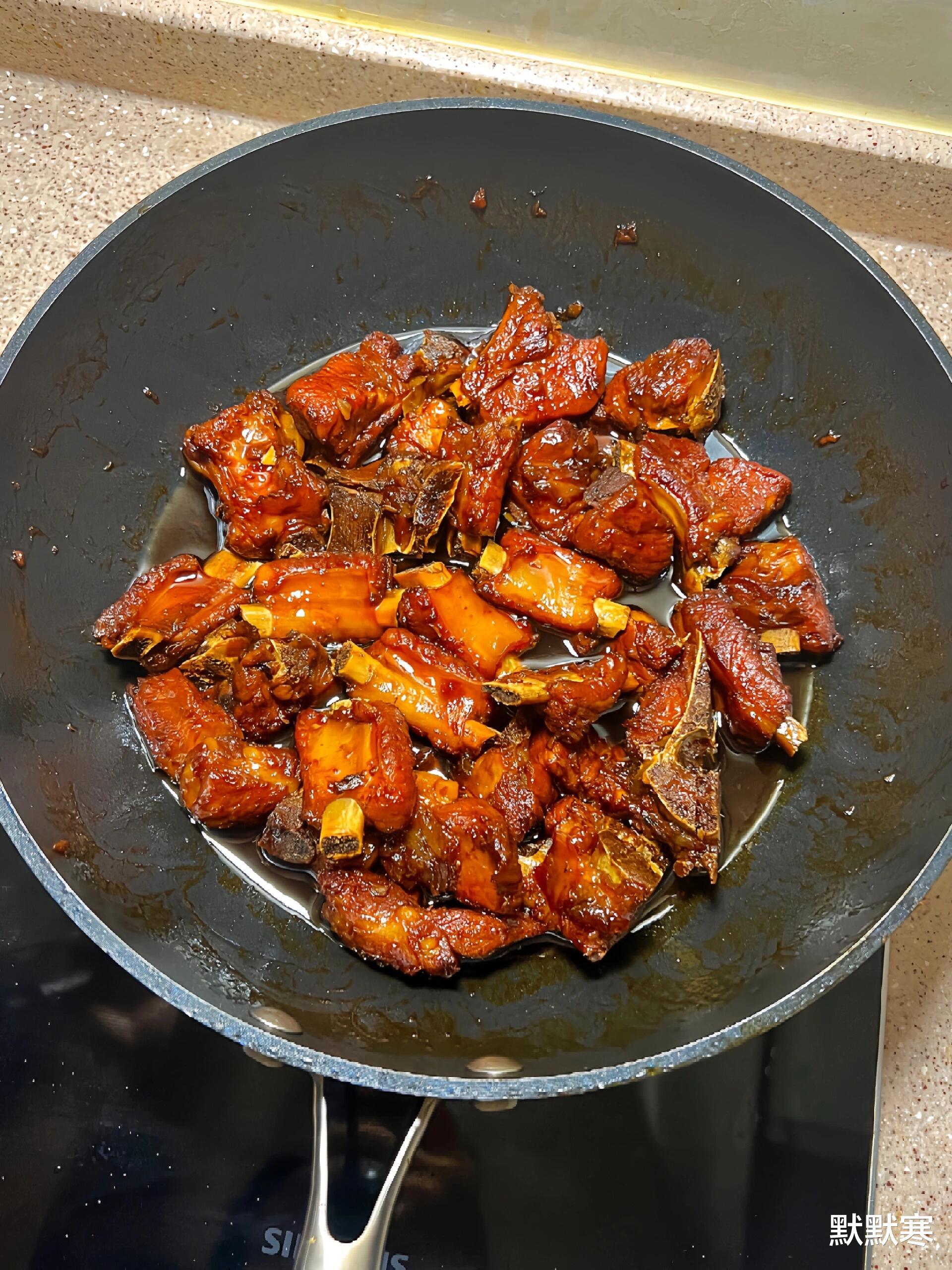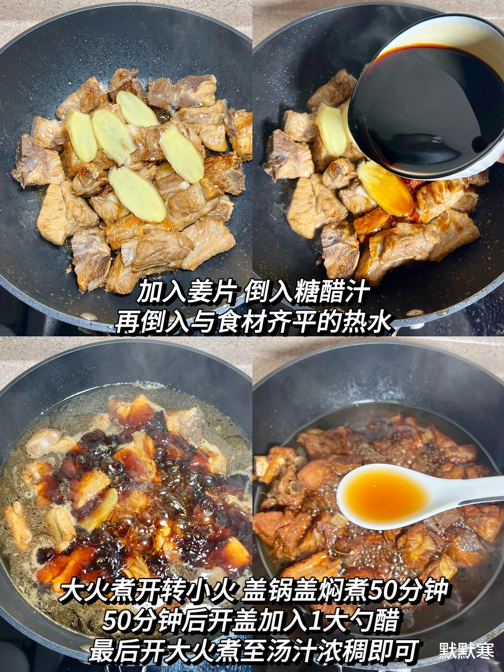 排骨裹好糖色后,加入一勺生抽,翻炒均匀,让排骨吸收生抽的鲜味。然后倒入调配好的醋,继续翻炒几下。接着加入开水,水量要没过排骨。大火煮开后,转小火盖上锅盖,慢慢炖煮。这个过程大概需要 30 到 40 分钟,让排骨充分吸收调料的味道,变得软烂入味。