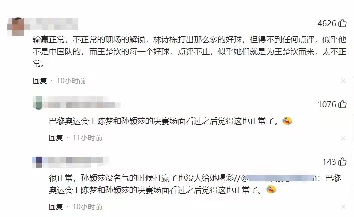 更绝的是,解说员那边也是偏心得明显,王楚钦一得分,那夸奖声跟不要钱似的往外冒,林诗栋打得好,却跟没看见似的,这哪儿是解说比赛啊,简直是“王楚钦专属拉拉队”。