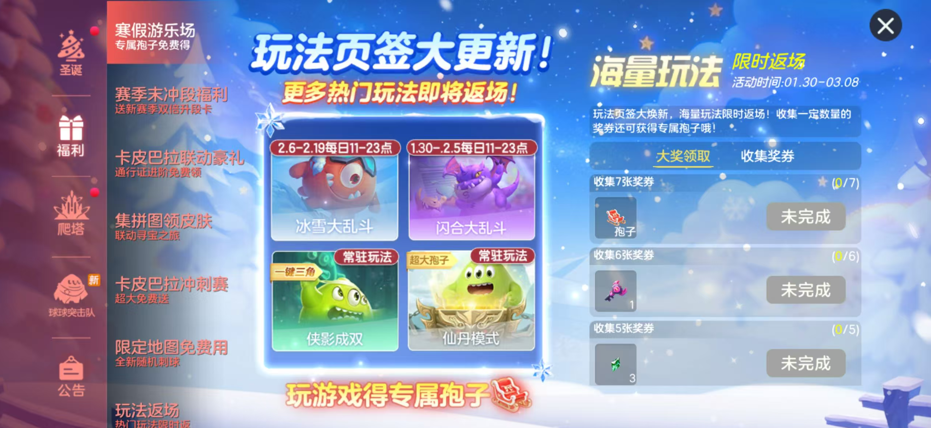 1月30日,寒假乐章正式奏响,持续至3月8日。海量经典玩法限时返场,构成欢乐主旋律。