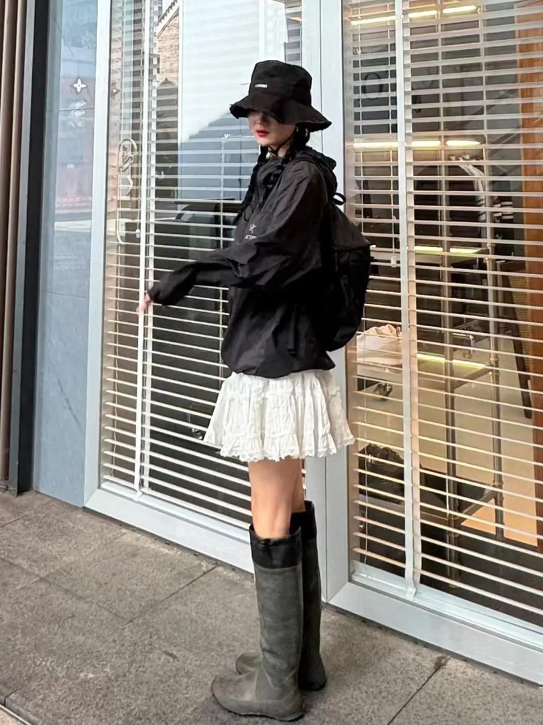 如果是想让造型更加个性有辨识度,穿冲锋衣可以搭配短款蛋糕裙,强调服装之间风格的鲜明对比,更能碰撞出绚烂的时尚火花。蛋糕裙增加腿部露肤,搭配过膝靴拉长腿线,有助于优化身材比例;渔夫帽配麻花辫发型,灵动又俏皮,美中带酷,尽显青春模样!