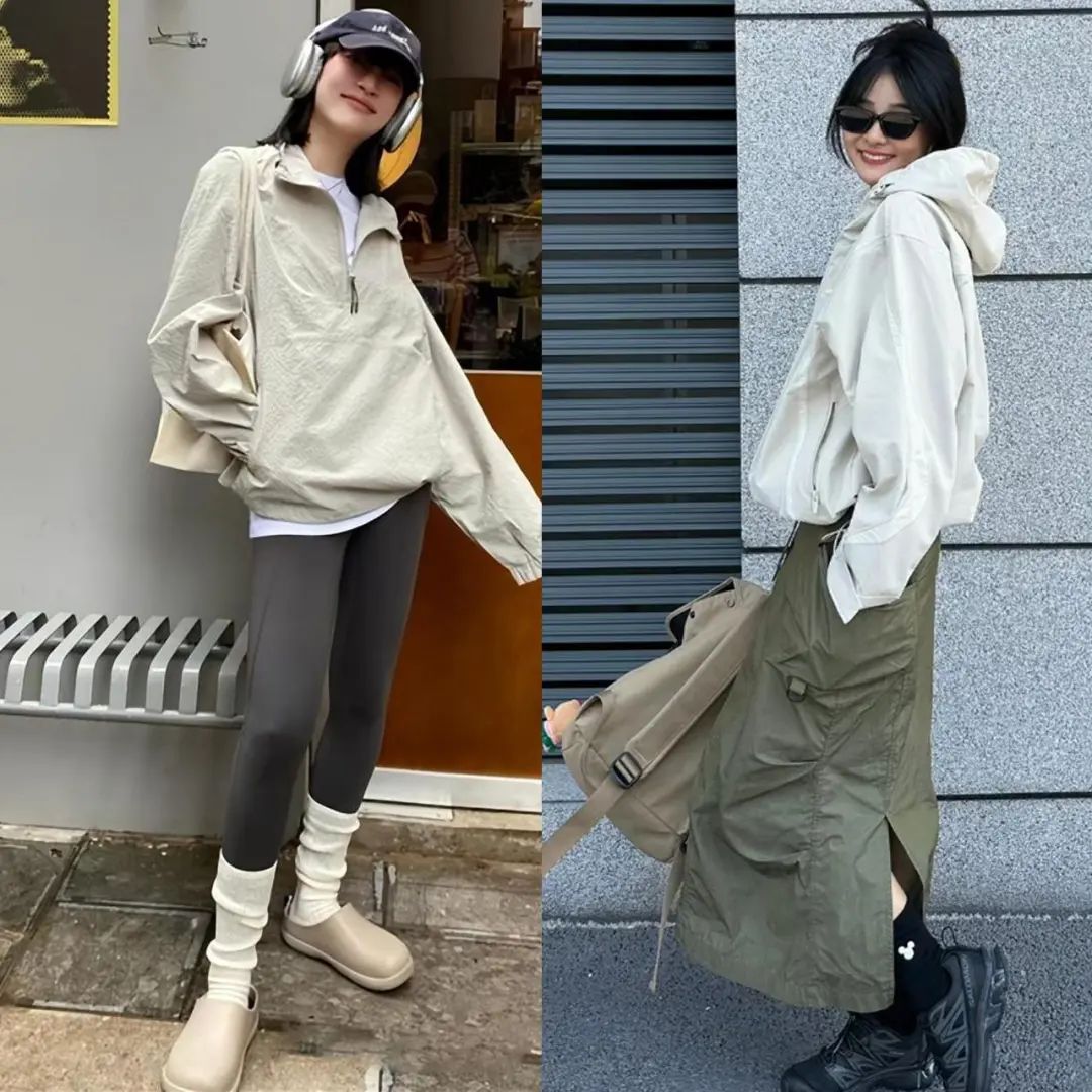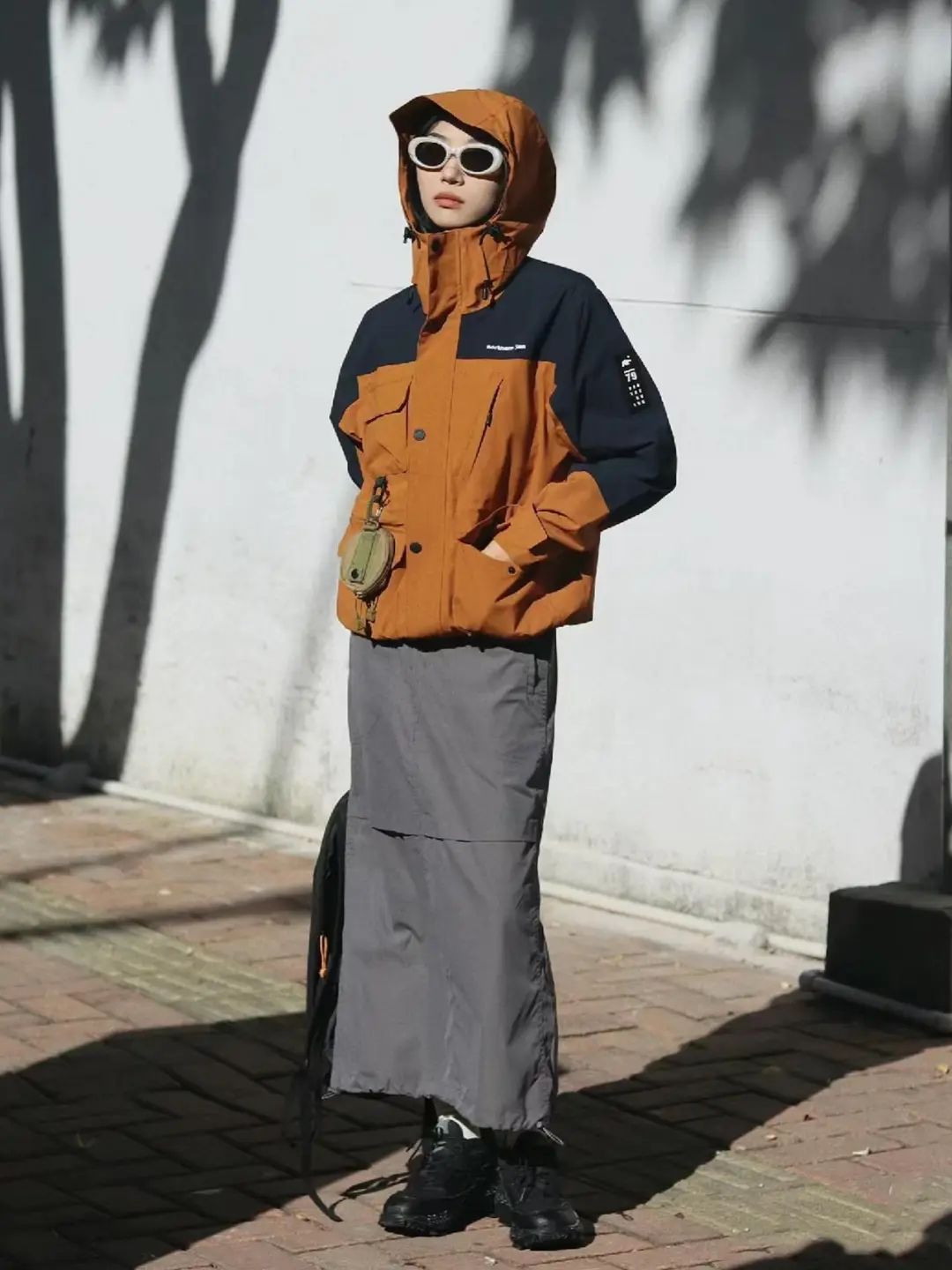 冲锋衣和工装裤,两者在风格上有些相似之处,都是户外单品,且都带有中性风格属性,搭配在一块就得做好色彩管理,避免花里胡哨。全身搭配的服装颜色以中性色为主,包括鞋子和配饰在内,保持色彩干净,看着简约舒适,也更能展现出女生的随性美。三、冲锋衣+不同款式的裙子,演绎百变风格01.冲锋衣+工装裙,户外森系女孩