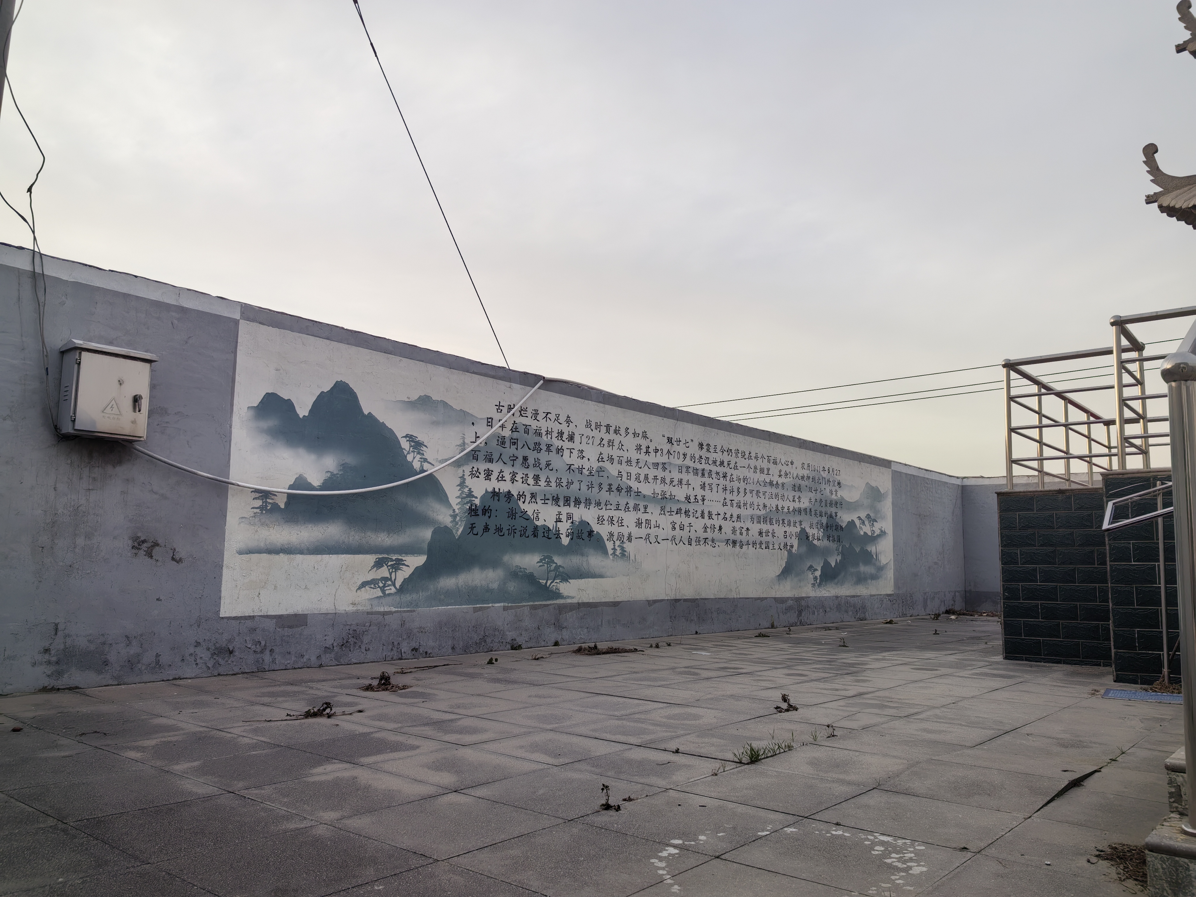 围墙东边写的是毛主席的词沁园春雪,西边记录了抗日战争时期这村发生的双二十七惨案和为革命牺牲的烈士们。抗日战争时期,这村的二十七位英雄为了保守革命机密,掩护八路军战士,全部惨死在日伪军的屠刀之下。…