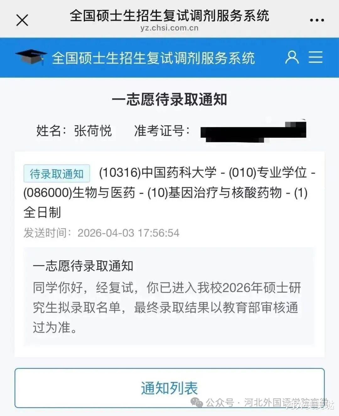 河北外国语学院国际医学院2021级生物制药专业的优秀学子张荷悦,成功圆梦中国药科大学,斩获硕士研究生录取资格。