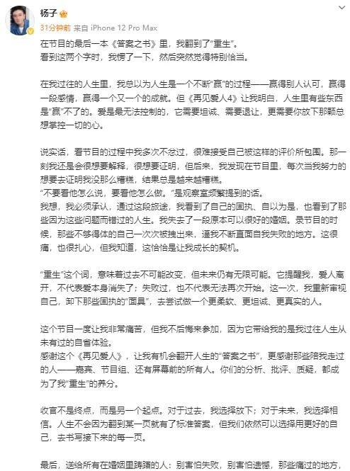 黄圣依和杨子,这对一直备受关注的夫妻,最终选择了“不下车”,也就是分开。 黄圣依说,她终于明白,爱不是牺牲和控制,而是自由和成长。这话听着挺有道理的,对吧?可是,这背后有多少无奈和挣扎,只有他们自己知道。杨子嘛,他的感悟更深沉些,他说,自己过去总想着赢,结果却输掉了婚姻。这得多痛的领悟啊!他意识到自己的固执和自以为是,错过了很多。想想看,要是能早点明白这个道理,或许结果会不一样呢?