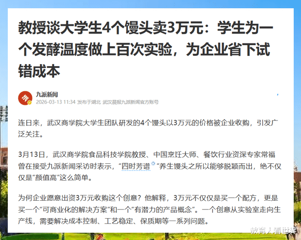 【今日话题】:高校组织大学生结合养生理念,开发馒头新品,被企业3万元买走创意和工艺,你认为这种培养模式,对大学生就业有哪些好处?欢迎在评论区聊聊你的看法。