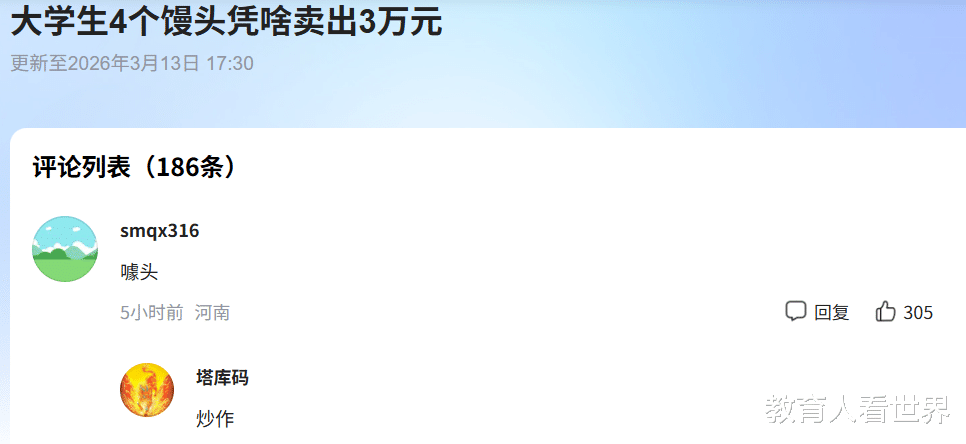 近日,武汉商学院这则新闻出来的时候,评论区里说什么的都有。有人说这是大学生利用信息差割韭菜,有人说这是学校在炒作,还有人酸溜溜地表示“现在的馒头都吃不起了”。