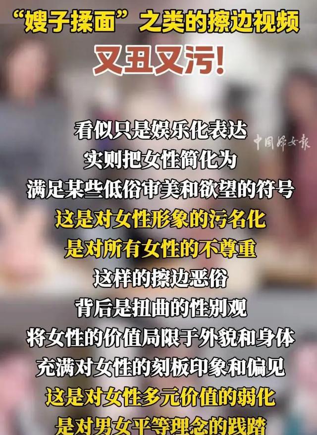 “嫂子揉面”这类擦边视频,带来的危害可不仅仅是污染网络环境这么简单,首先它严重侮辱了女性的尊严,在这些视频中,女性被异化成了性幻想的对象,身体被物化、商品化,完全失去了应有的尊重。