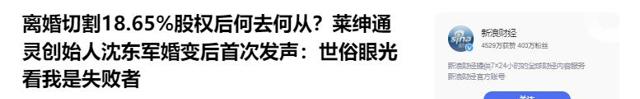 新浪财经:离婚切割18.65%股权后何去何从?莱绅通灵创始人沈东军婚变后首次发声:世俗眼光看我是失败者