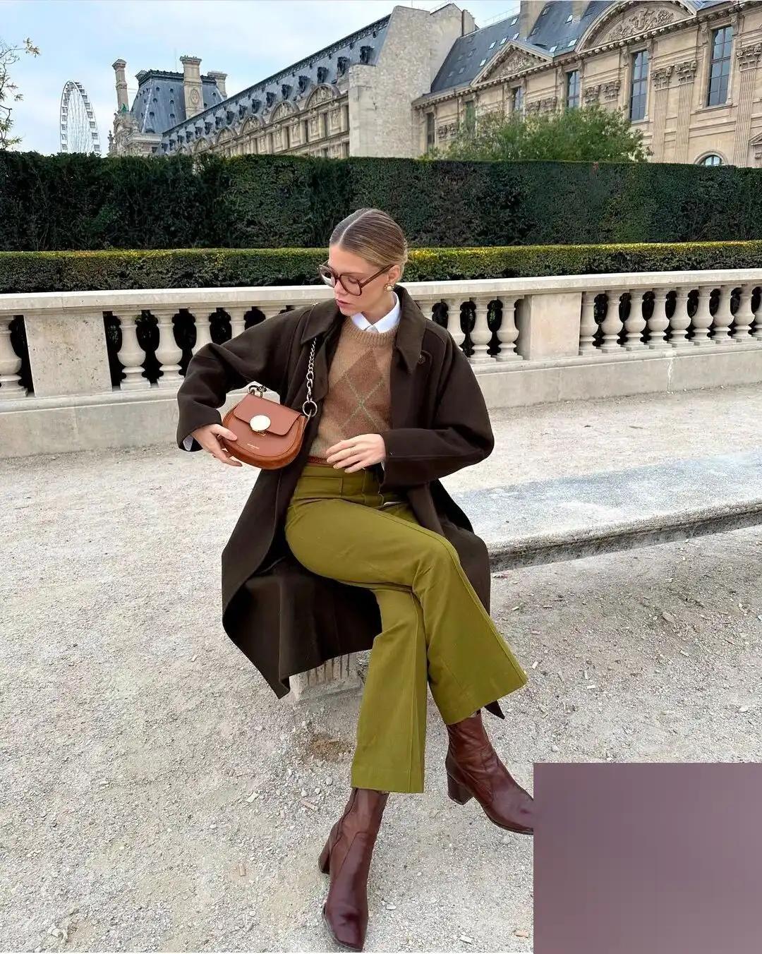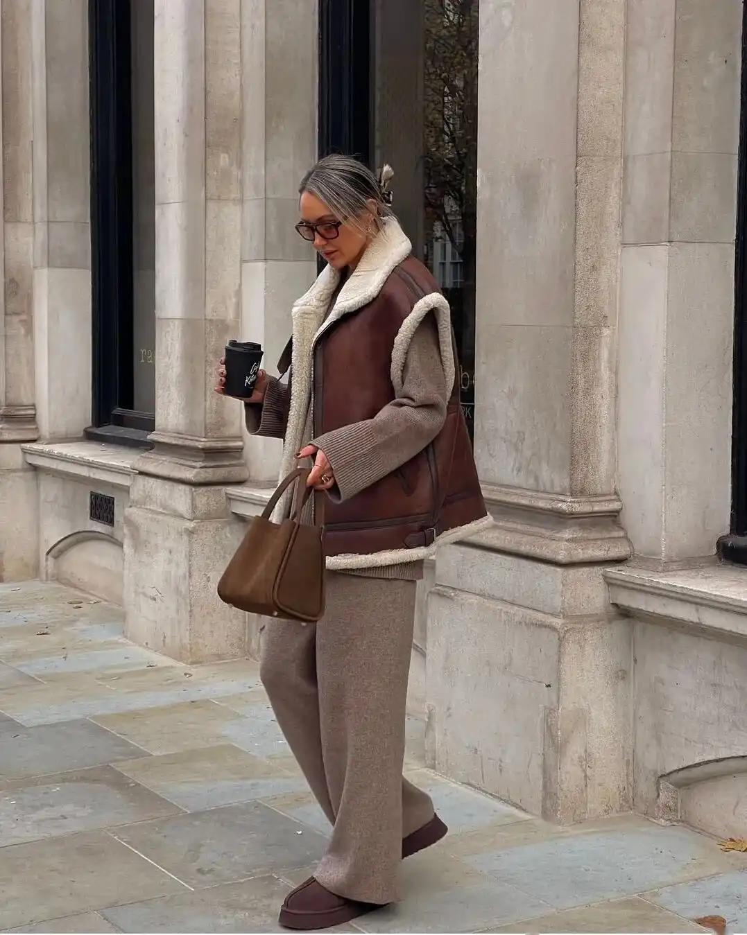 如果你选择的是浅棕色的针织套装,那么可以搭配一双深棕色的小棕靴,这样的同色系搭配能够形成一种层次感,给整体造型增添一抹亮色,非常好看。
