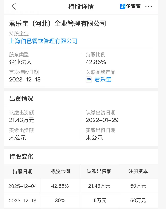 值得注意的是,茉酸奶自身近期也刚完成一场权力更迭:创始人赵伯华卸任全部职务并清空股份,彻底离场;原联合创始人、加盟商出身的顾豪成为控股股东及法定代表人。与此同时,乳企君乐宝以21.43万元出资获得了茉酸奶运营主体42.86%的股权。
