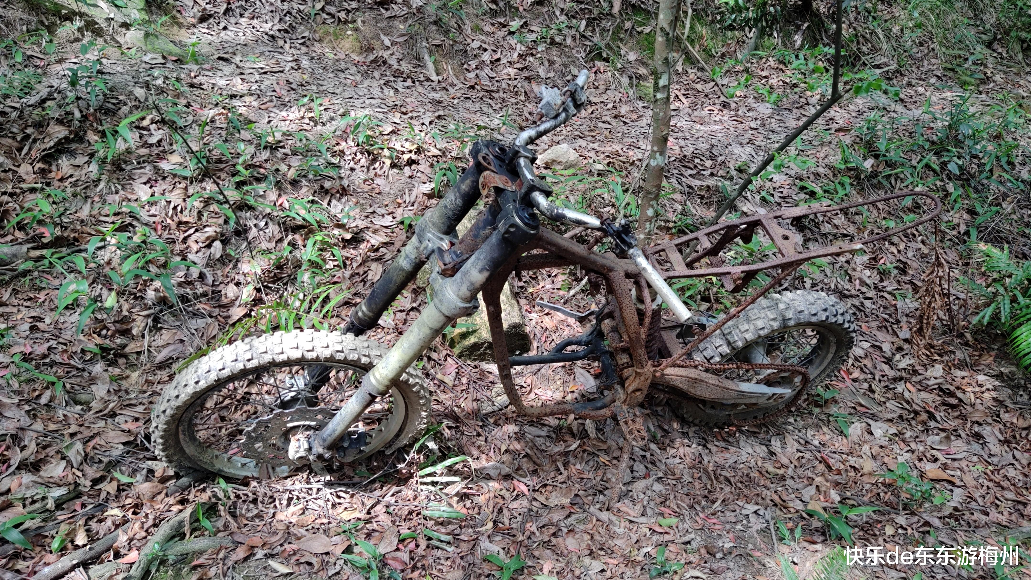 梅州客天下景区与泮坑景区之间的树林里,有一条鲜为人知的登山古道,是当年太平军从梅城向丰顺北溪南逃时走过的路。从梅州市清凉山供水公司背面这条石砌古道上去,走了半个多小时后,在一处山坳里看到一辆锈迹斑斑的男装摩托车的车架!除了金属车架和前后轮,其它部分基本都没有了,前后轮的橡胶轮胎和金属车架上有多处被火烧过的痕迹!这是什么品牌什么型号的摩托车?在这里有多久了?为何只剩下车架?为什么会有烧过的痕迹?这里到底曾经发生过什么事件?要不要报警呢?这些谜团让我感到困惑不解。