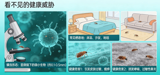 关键关联:螨虫排泄物和尸体是诱发哮喘、过敏性鼻炎的重要过敏原,尤其在夜间睡觉时,人体长时间接触被褥中的螨虫,容易引发夜间或清晨的症状发作。