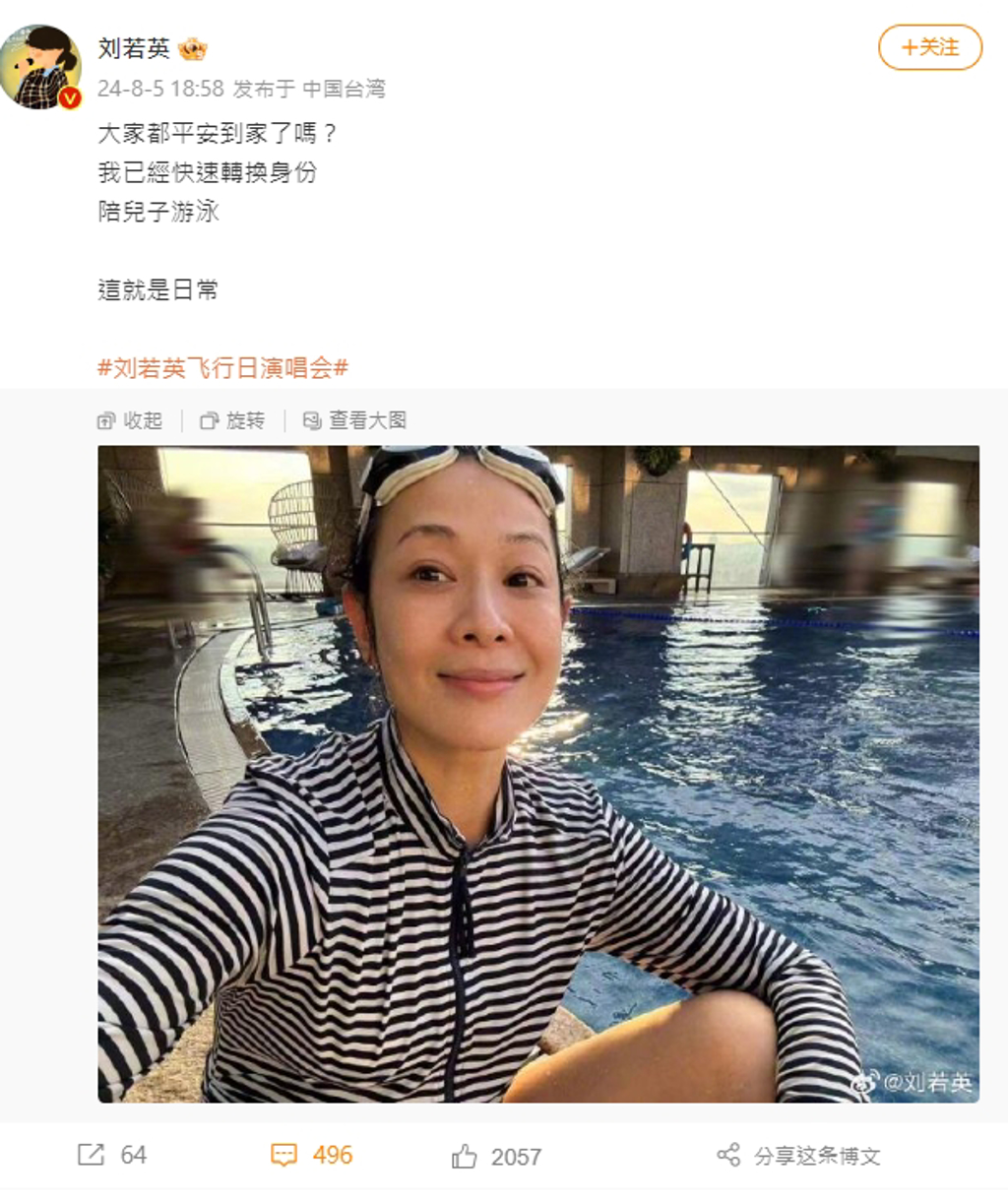 刘若英更新微博贴文,曝光平凡日常,笑称自己已经快速转换回妈妈身分,陪儿子游泳。晒出的自拍照中,刘若英对着镜头微笑,在泳池旁身穿黑白条纹泳衣、戴着蛙镜,私下真实素颜状态曝光,保养得宜,冻龄状态脸蛋肌肤平滑,零瑕疵真实模样震惊全网。