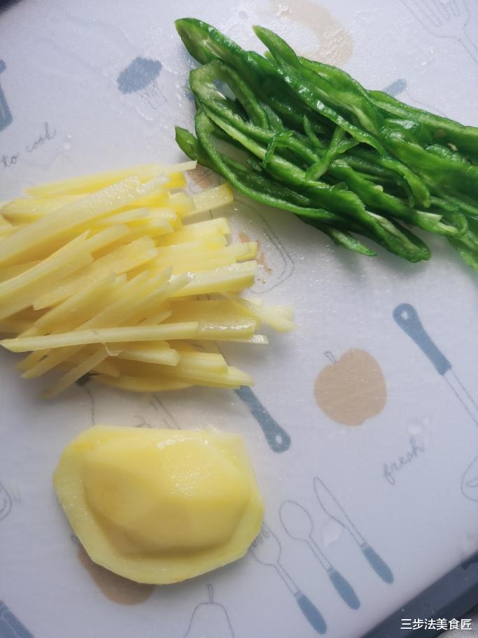 在腌制肉丝的同时,我们来准备青椒和土豆。青椒洗净后去籽,切成细丝;土豆去皮后切成同样大小的丝,切丝的时候记得尽量保持一致,这样可以确保土豆在炒的时候均匀受热。