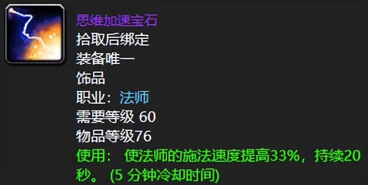 对于职业紫色饰品,喵叔思来想去给到的是思维加速宝石,毕竟法师这个暴雪亲儿子职业人群基数也是多的很恐怖如斯,更别说该饰品本身在后期也大有作为,所以也是广为玩家所熟知,问题就是怀旧服还是有很多玩家不识货,喵叔就见过这东西烂了的情况,也是十分可惜,毕竟喵叔小法师浠瓦就不曾遇见过捡漏的机会,你敢信!