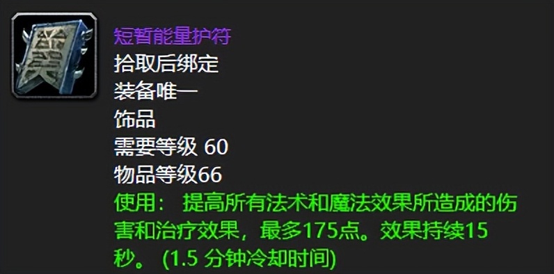 熔火之心作为史诗级经典团本,在初期搅动风云的就是这款短暂能量护符了,1.5分钟的CD奠定了他早期最强爆发饰品的核心地位,基本上也只有在后期赞达拉崛起后他的身影才会淡出玩家的视野,实在是各位资深大兄弟版本初期必争极品!
