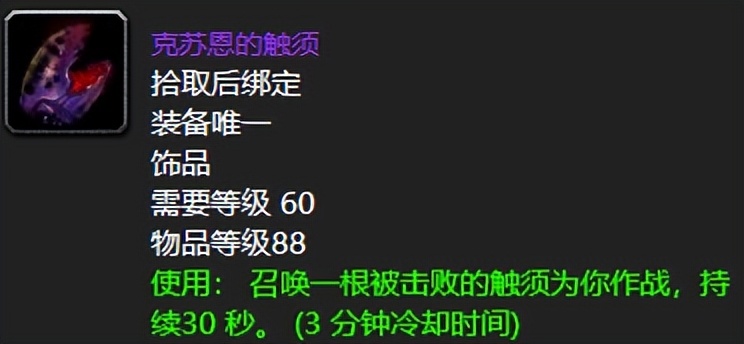 今日份压轴的话喵叔给到的是版本最让玩家惊掉下巴同样耳熟能详的克苏恩触须,难以想象,这丫的竟然是让无数团队闻风丧胆躺地板无数次的大眼睛之神克苏恩掉落,当然对于玩具性饰品的他,其实对盗贼刷军需官还是非常实用的,有他基本上不可能翻车,所以总结一句话来说,这货出名的理由就是压根不太有人会愿意见到他,因为真的根本没人要啊!就问问屏幕前的大兄弟有没有带过的?