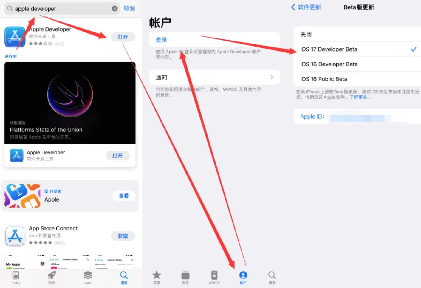 想要升级的朋友可安装 Apple Developer 应用,然后在里面登录自己的 Apple ID,随后在手机的设置—通用—软件更新—Beta 版中再次登录你的账号,这样就能刷新了。