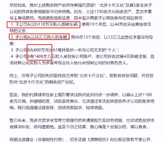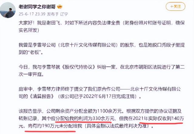 曾为李雪琴“榜一大哥”兼经纪人的老谢,突然晒出长文控诉:“合作4年,她欠我190万利润不结,公司账目全是窟窿!”