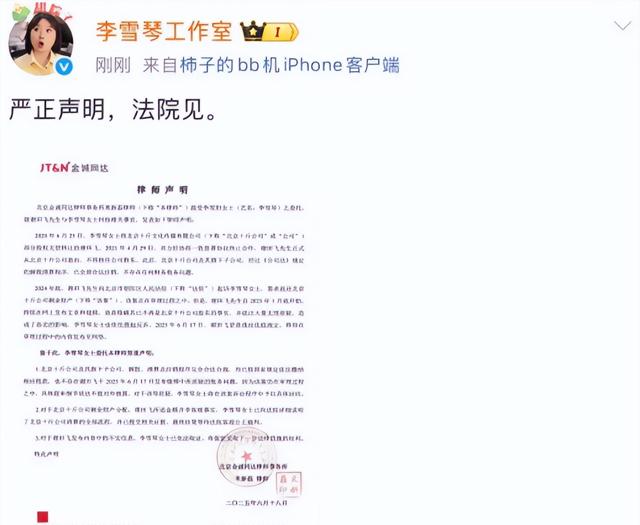 李雪琴团队反应极快,第二天就正面回应,甩出“法院见”三个字,并通过律师声明全盘否认指控,称老谢涉嫌诽谤并要求其删帖赔偿10万元。