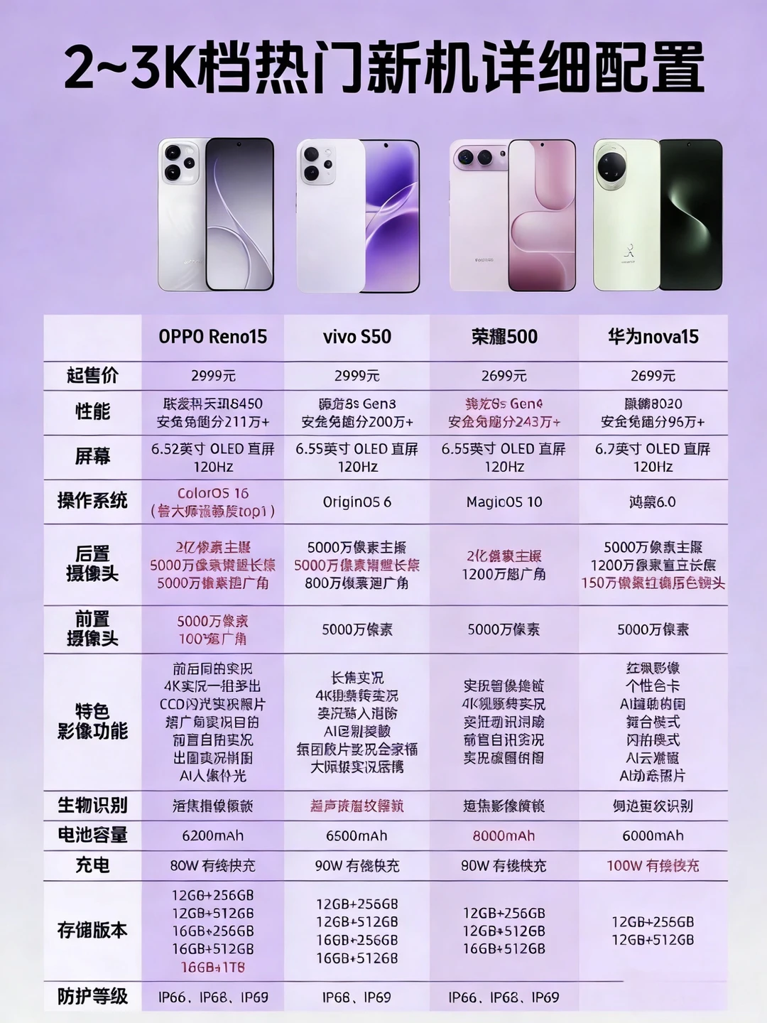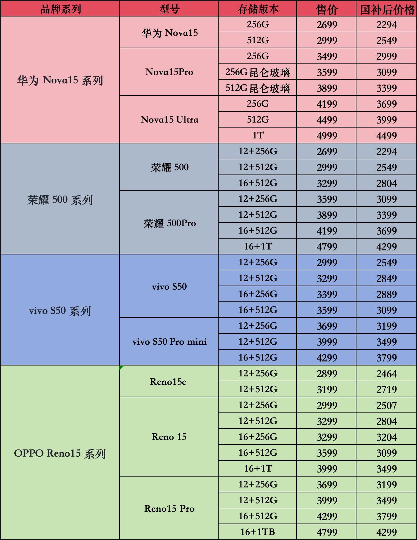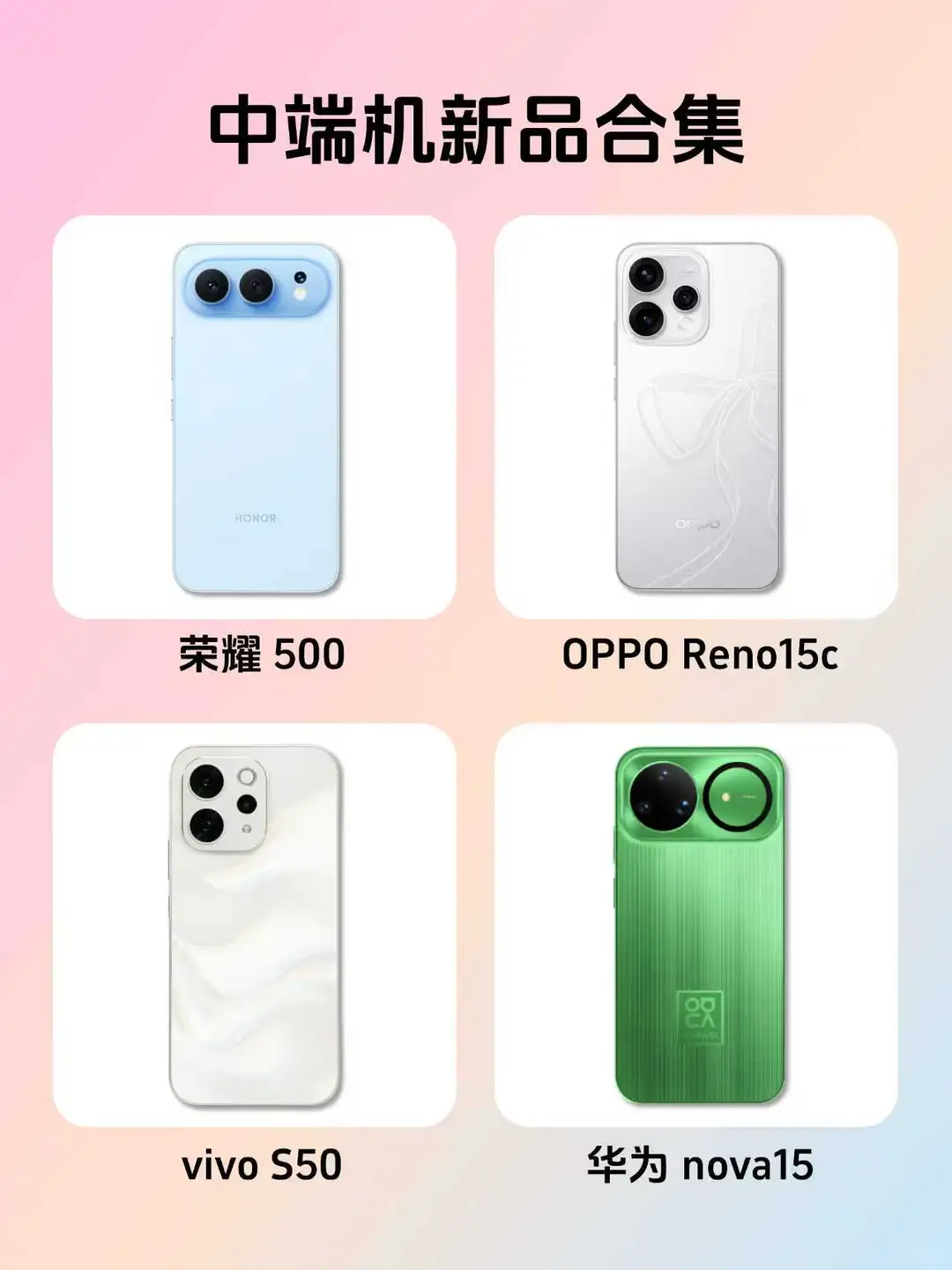写在前面:此次挑选的是华为Nova15/Nova15Pro/15Ultra、荣耀500/500Pro、vivoS50/S