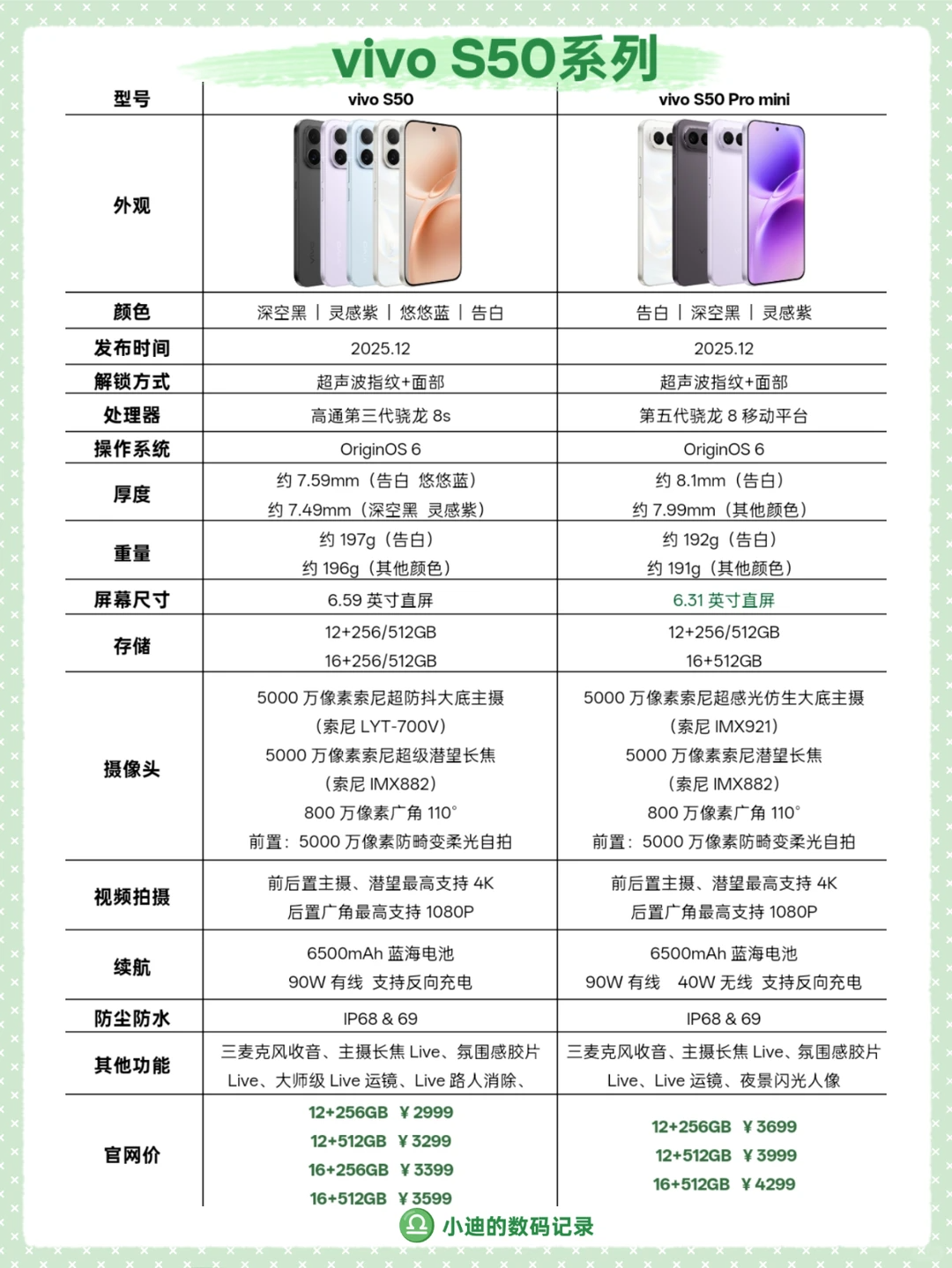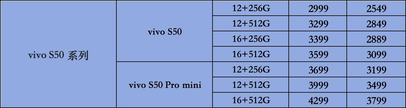 vivo S50 Pro mini:12+256G 3699(国补后3199),12+512G 3999(国补后3499),16+512G 4299(国补后3799)