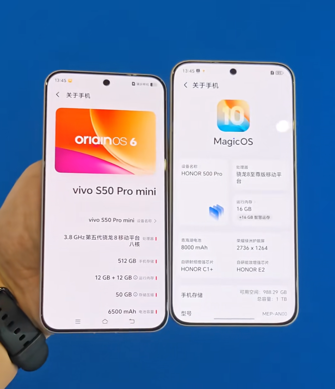 vivoS50两款手机则是不同的设计,标准版是左侧矩形模组,而Pro mini则跟荣耀500有点类似,是横向长条的跑道设计。