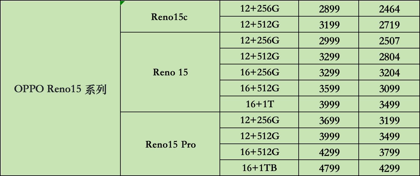 Reno15:12+256G:2999(国补后2507)、12+512G:3299(国补后2804)、16+256G:3299(国补后3204)、16+512G:3599(国补后3099)、16+1TB:3999(3499)