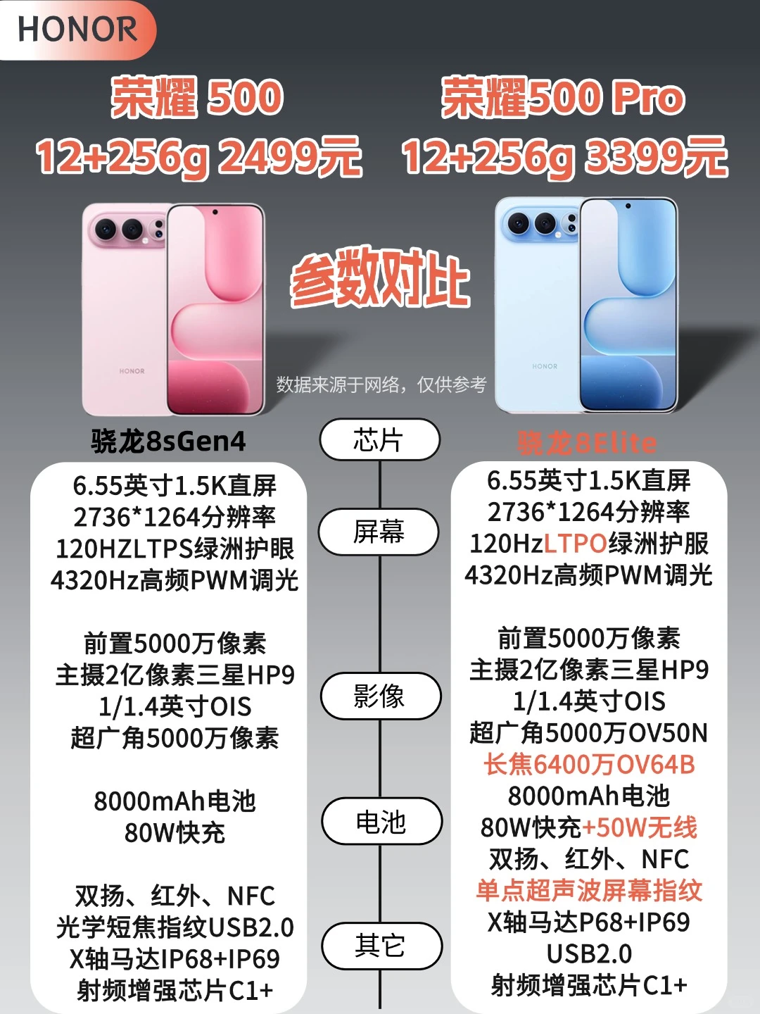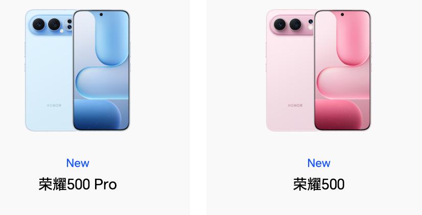 荣耀500系列:骁龙8sGen4(荣耀500)、骁龙8至尊版Elite(荣耀500Pro)