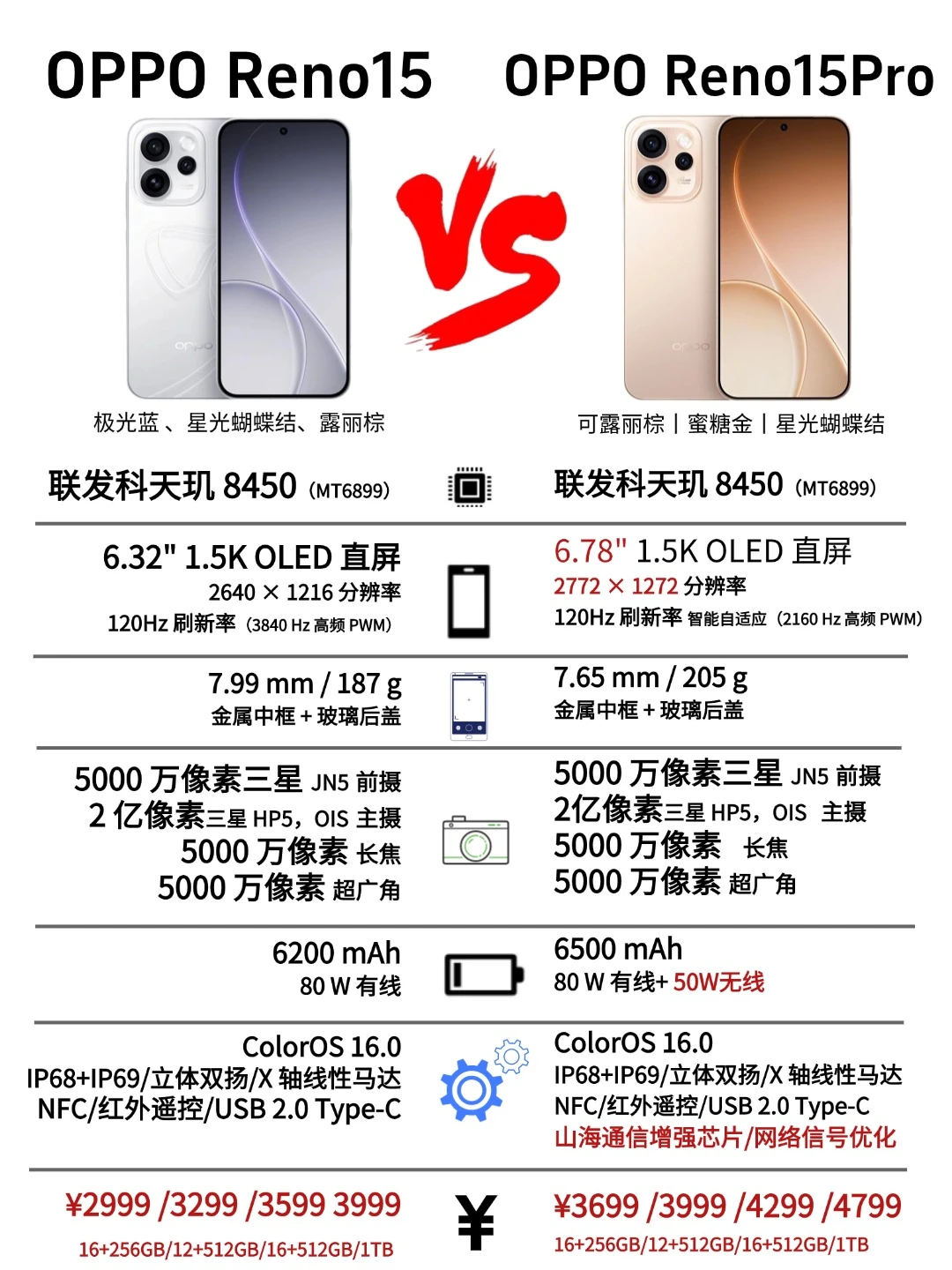 Reno15 Pro:12+256G 3699(国补后3199)、 12+512G:3999(国补后3499)、 16+512G:4299(国补后3799)、16+1TB:4799(国补后4299)