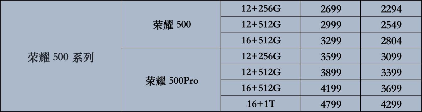 荣耀500:12+256 2699(国补后2294)、12+512G 2999(国补后2549)、16+512G 3299(国补后2804)