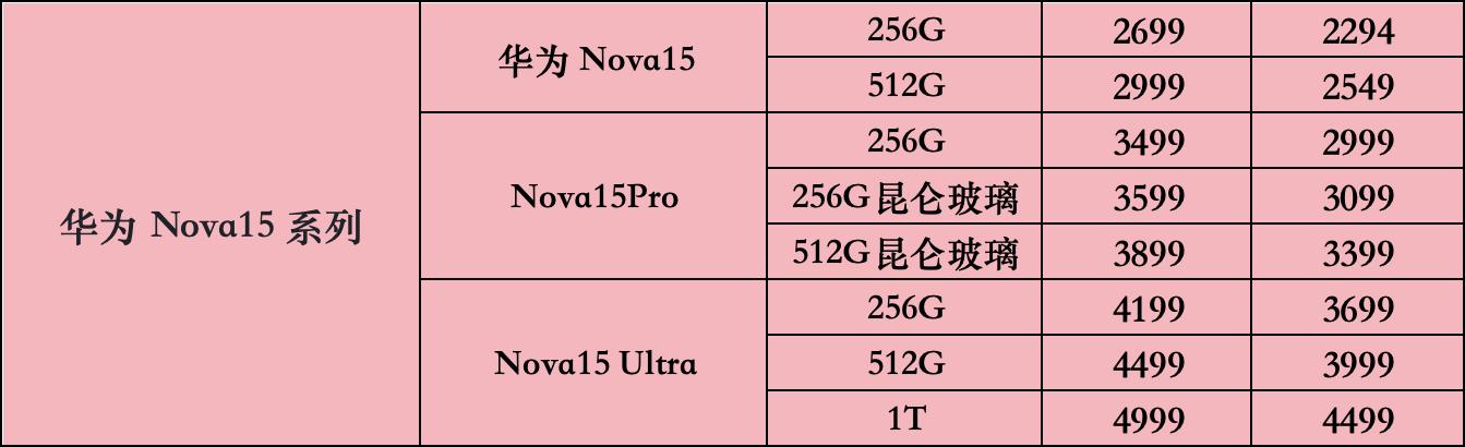 Nova15 Ultra:256G 4199(国补后3699)、512G 4499(国补后3999)、1T 4999(国补后4499)。