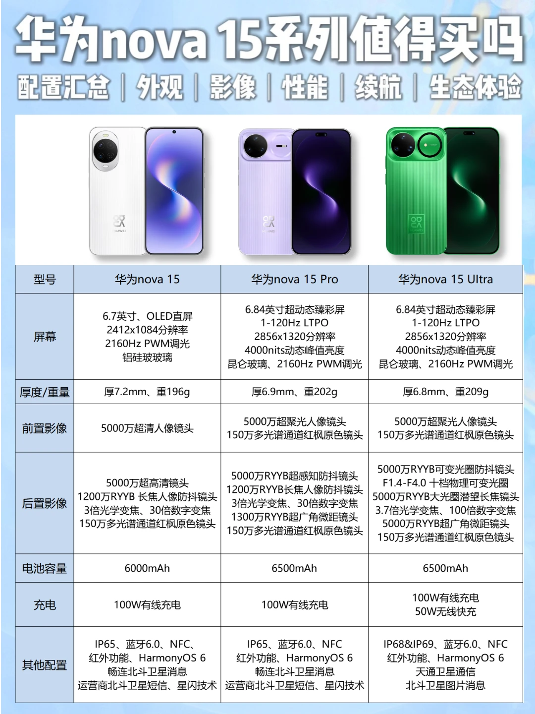 华为Nova15是6.7英寸,分辨率2412*1084、Nova15Pro和Nova15Ultra则是6.84英寸LTPO大屏(支持1-120Hz动态刷新),分辨率2856*1320,最高4000尼特峰值亮度。