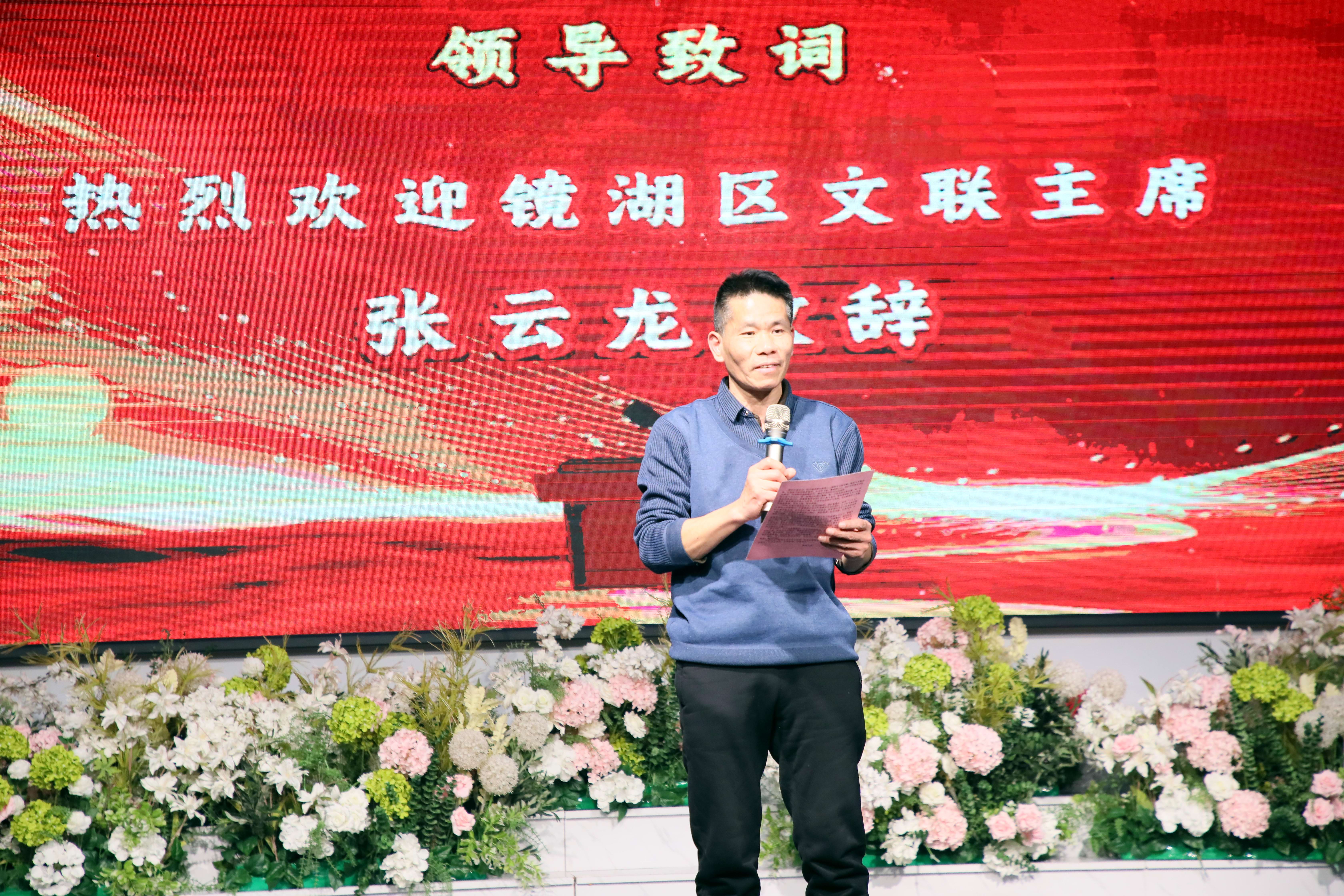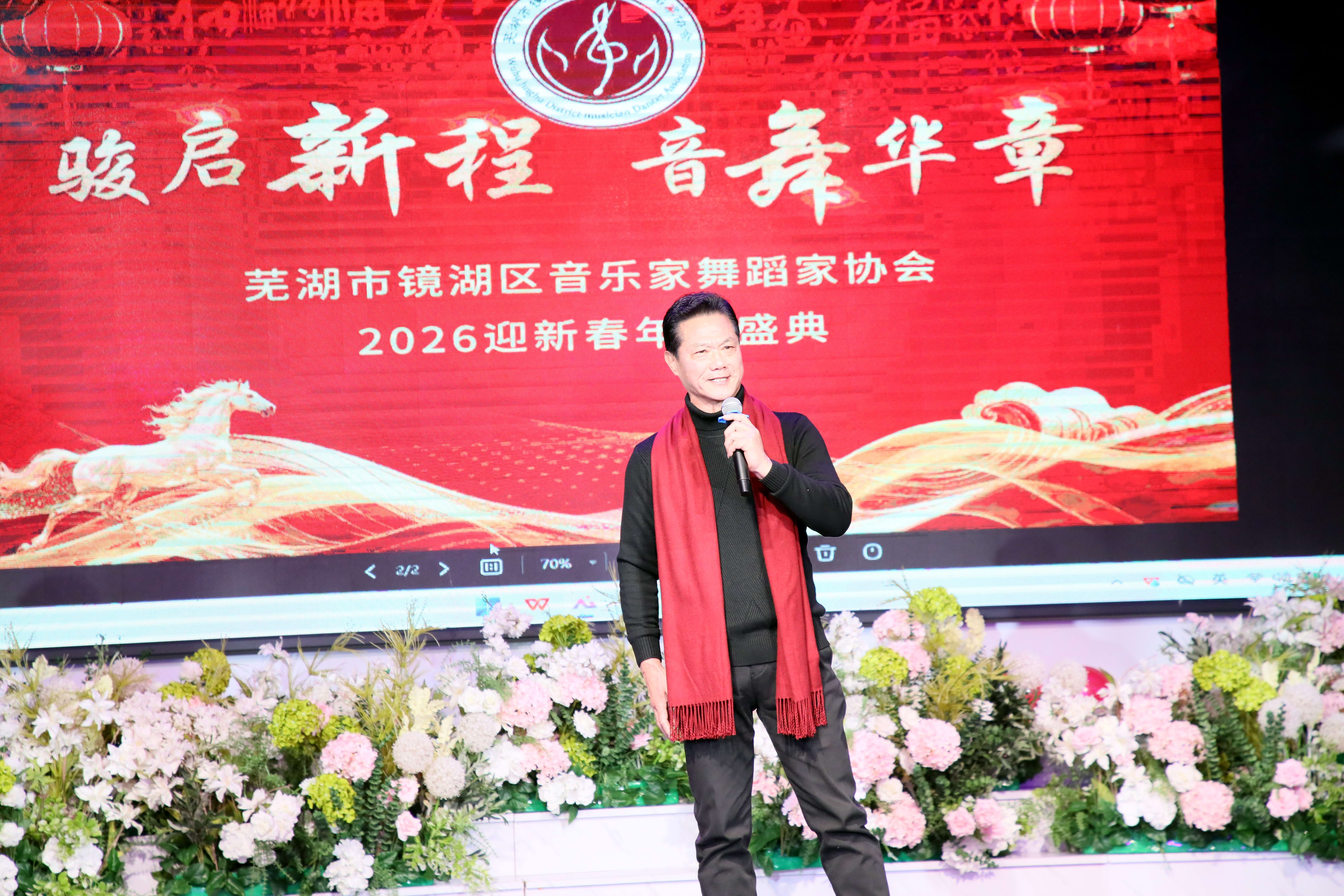在热烈的掌声中,镜湖区文联主席张云龙登台致辞,他高度肯定了音舞协会过去一年在繁荣区域文化、服务基层群众方面取得的卓越成绩,并寄语艺术家们在新的一年里继续扎根人民、守正创新,用更多精品力作讲好镜湖故事、传递时代强音。