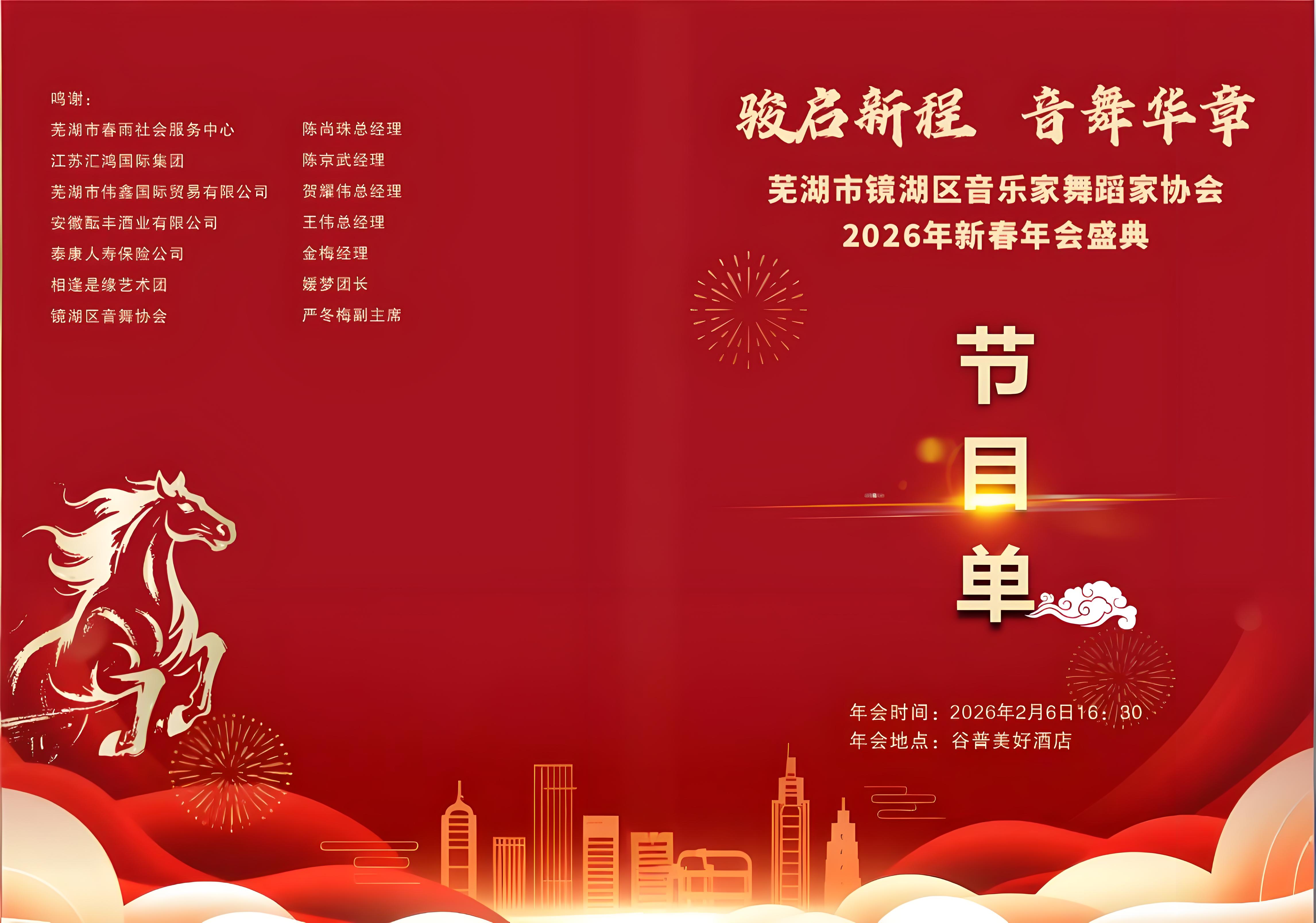 旧岁已展千重锦,新年再进百尺竿。站在2026年的起点,芜湖市镜湖区音乐家舞蹈家协会将在区委宣传部和区文联的坚强领导下,以此次盛会为新的起跑线,满载着社会的期待与自身的艺术理想,携手并肩,骏程再启。他们将继续以音符为舟,以舞姿为翼,在镜湖这方文化热土上,耕耘不辍,创新不止,为繁荣社会主义文艺事业、满足人民日益增长的美好生活需要,谱写更加璀璨夺目的时代华章!春山在望,未来可期,镜湖音舞的故事,必将更加动人。