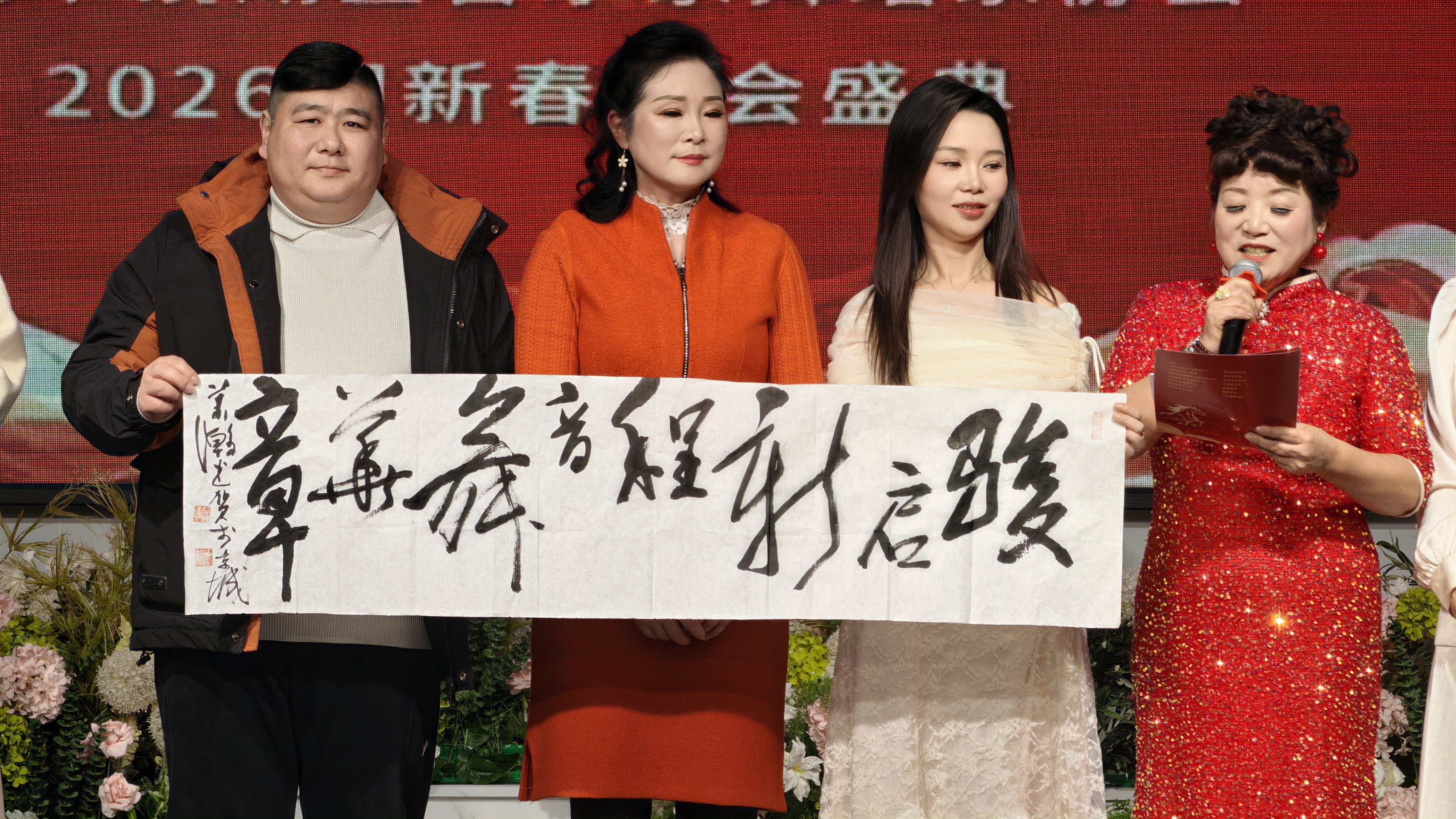 年会在四位主持人何瑾、唐雨婷、徐蓓、卢雪停联袂登场中拉开帷幕。他们以诗意的语言,将现场带入艺术的殿堂:“金蛇辞旧岁,骏马踏春来。在这辞旧迎新、万家团圆的美好时刻,我们满怀喜悦与豪情,欢聚一堂……”