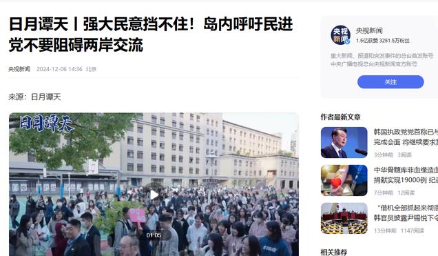 2.《日月谭天丨强大民意挡不住!岛内呼吁民进党不要阻碍两岸交流》央视新闻2024-12-06 14:36北京