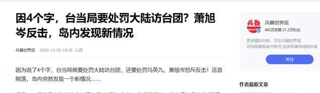 3.《因4个字,台当局要处罚大陆访台团?萧旭岑反击,岛内发现新情况》兵器世界观2024-12-05 18:10山西