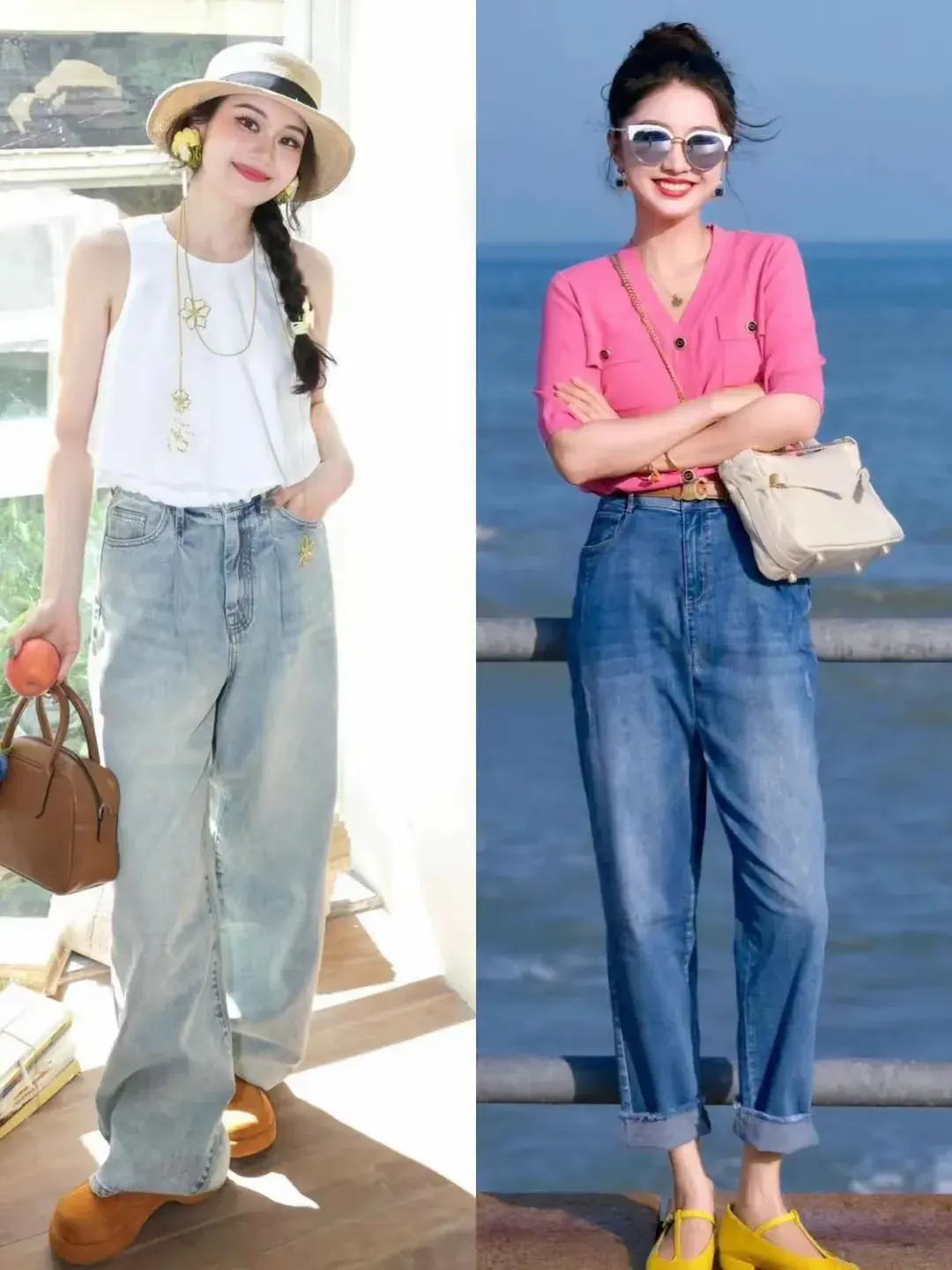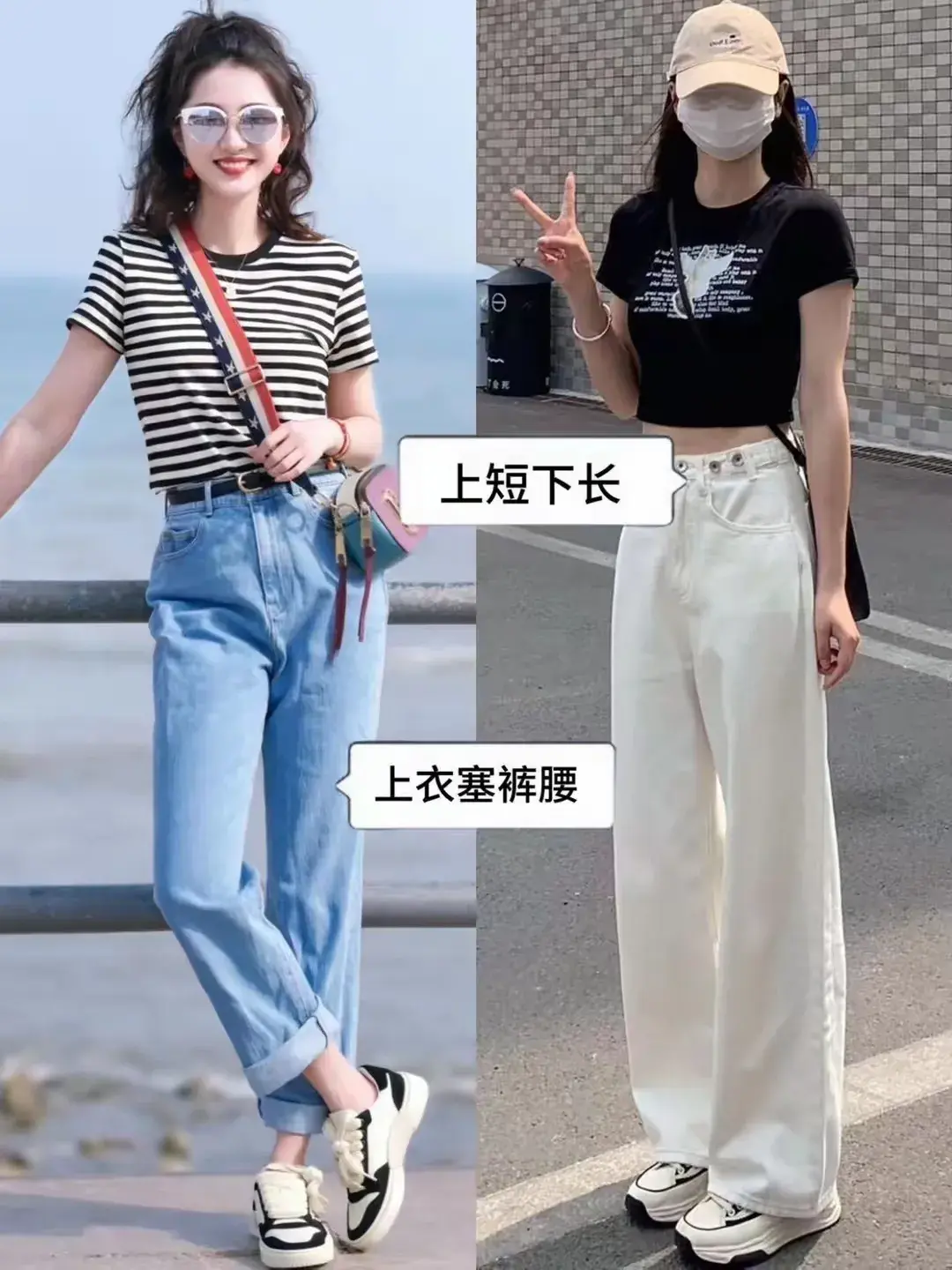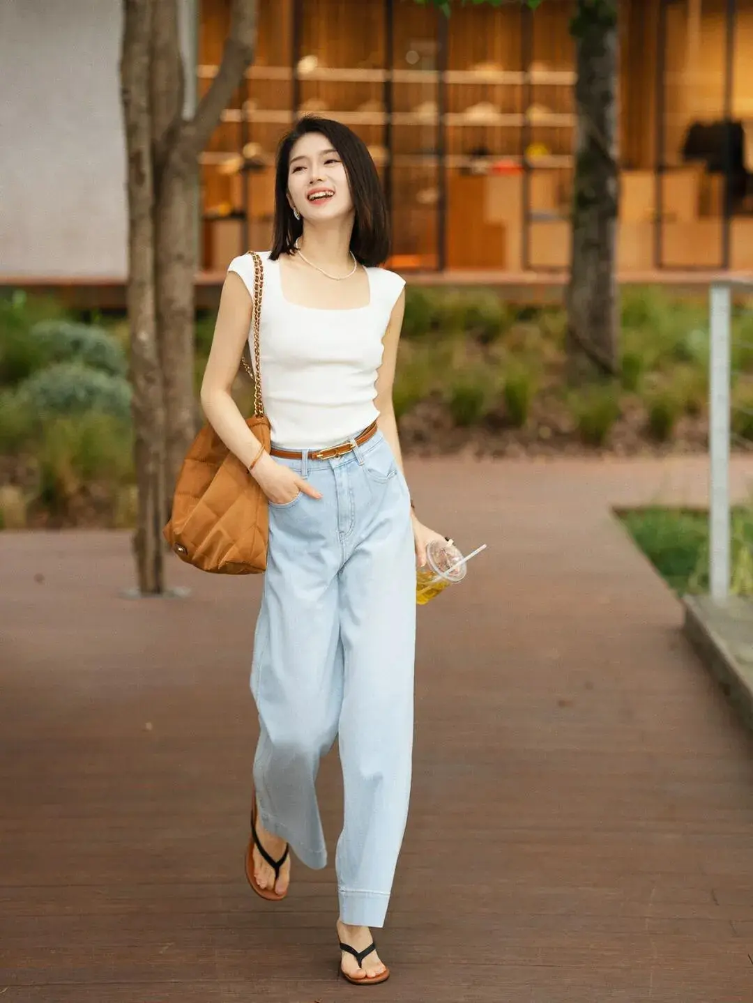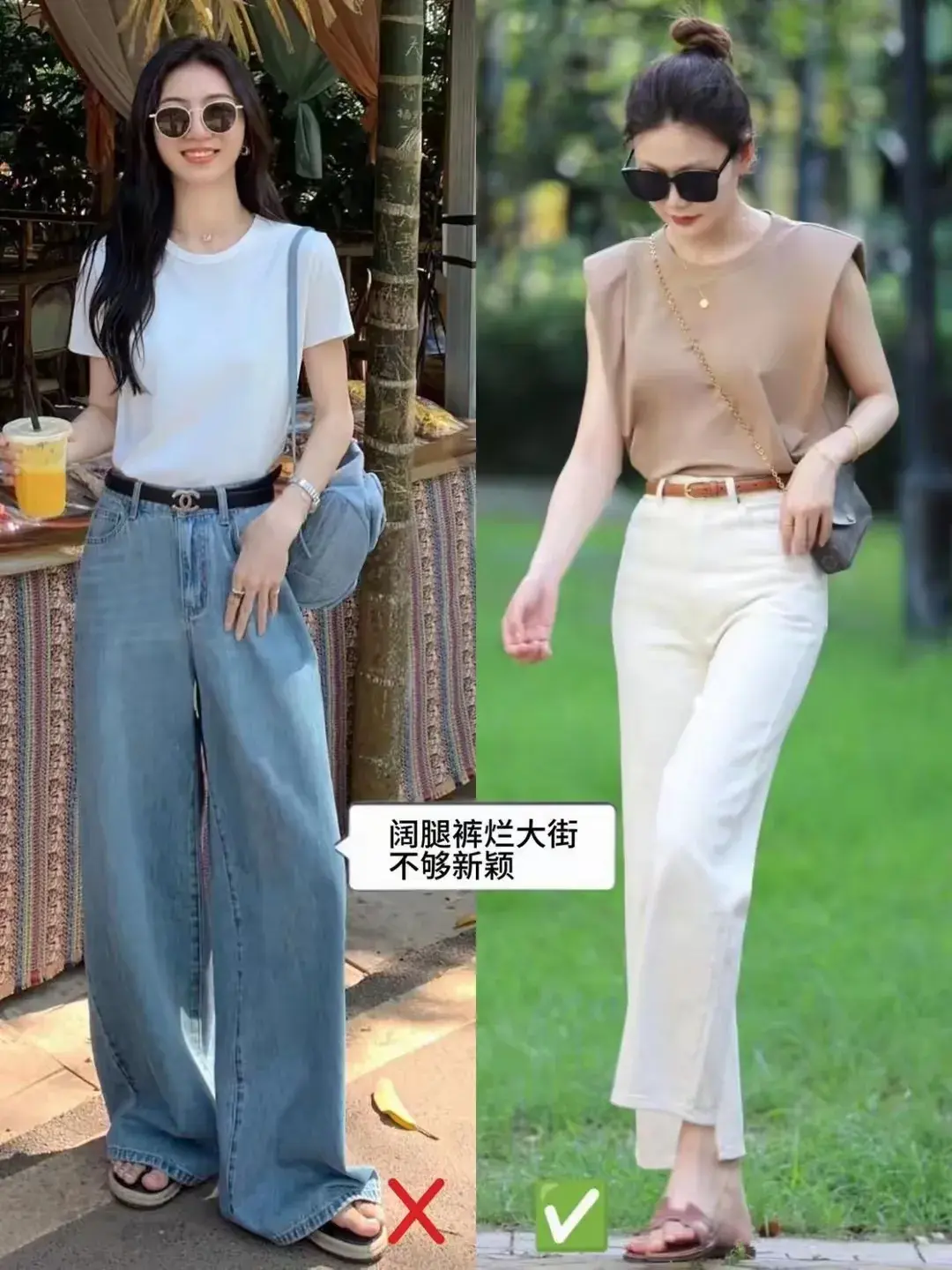 当然也多选一些牛仔裤,但是尽量不选过于宽松的阔腿牛仔裤,可以向下面这位博主一样选择白色的九分牛仔裤,这种裤子非常好搭配,而且能修饰出笔直的美腿。