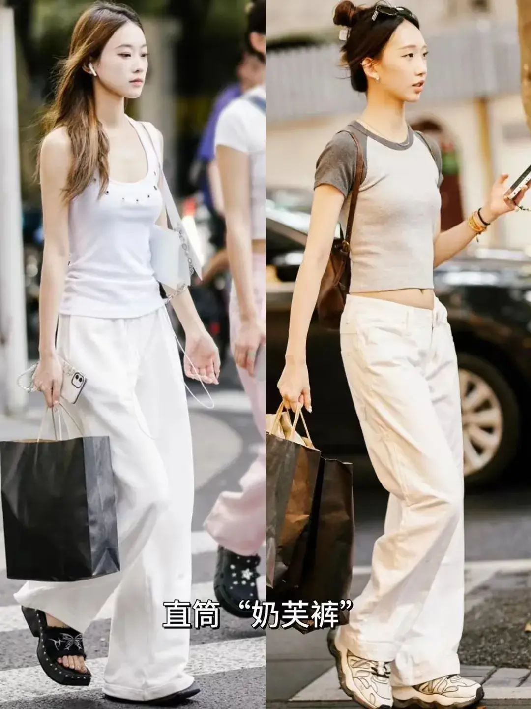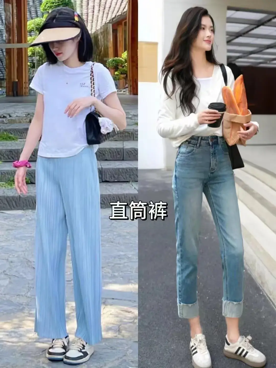 同时我也很推荐大家尝试直筒裤,直筒裤,不管是小个子女生还是高个子女生都可以轻松驾驭,像下面这两位博主搭配上短袖的上衣或者是白色的,放你上衣都是很不错的选择。