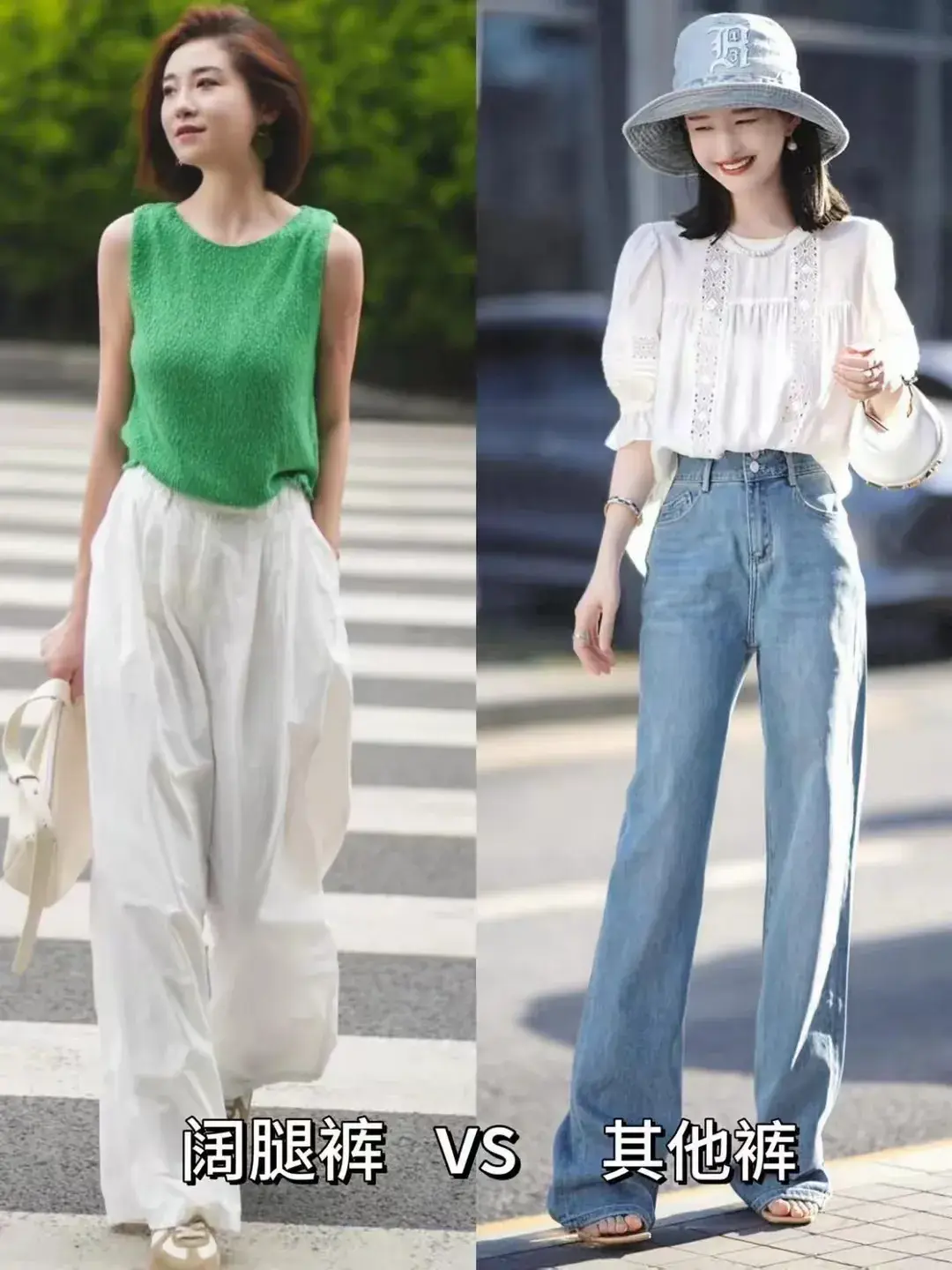 低腰裤和高腰裤的对比是很明显的,大家看下面这两条裤子只是版型的不同,穿出来的效果天壤之别,还是右手边的这条裤子会更显腿长。