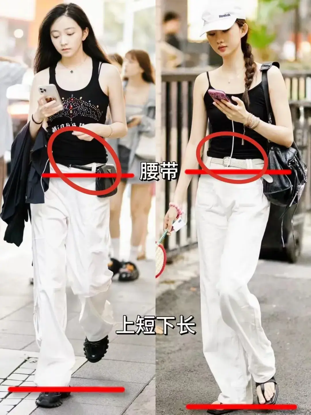 想要穿着高腰收腰的骑士效果,我们可以选用上短下长的搭配方式,就像下面这两身穿衣造型,用黑色的背心搭配上白色的长裤,中间加上一款黑色的腰带,勒住小蛮腰,提升腰线就能达到一个三七粉的身材效果