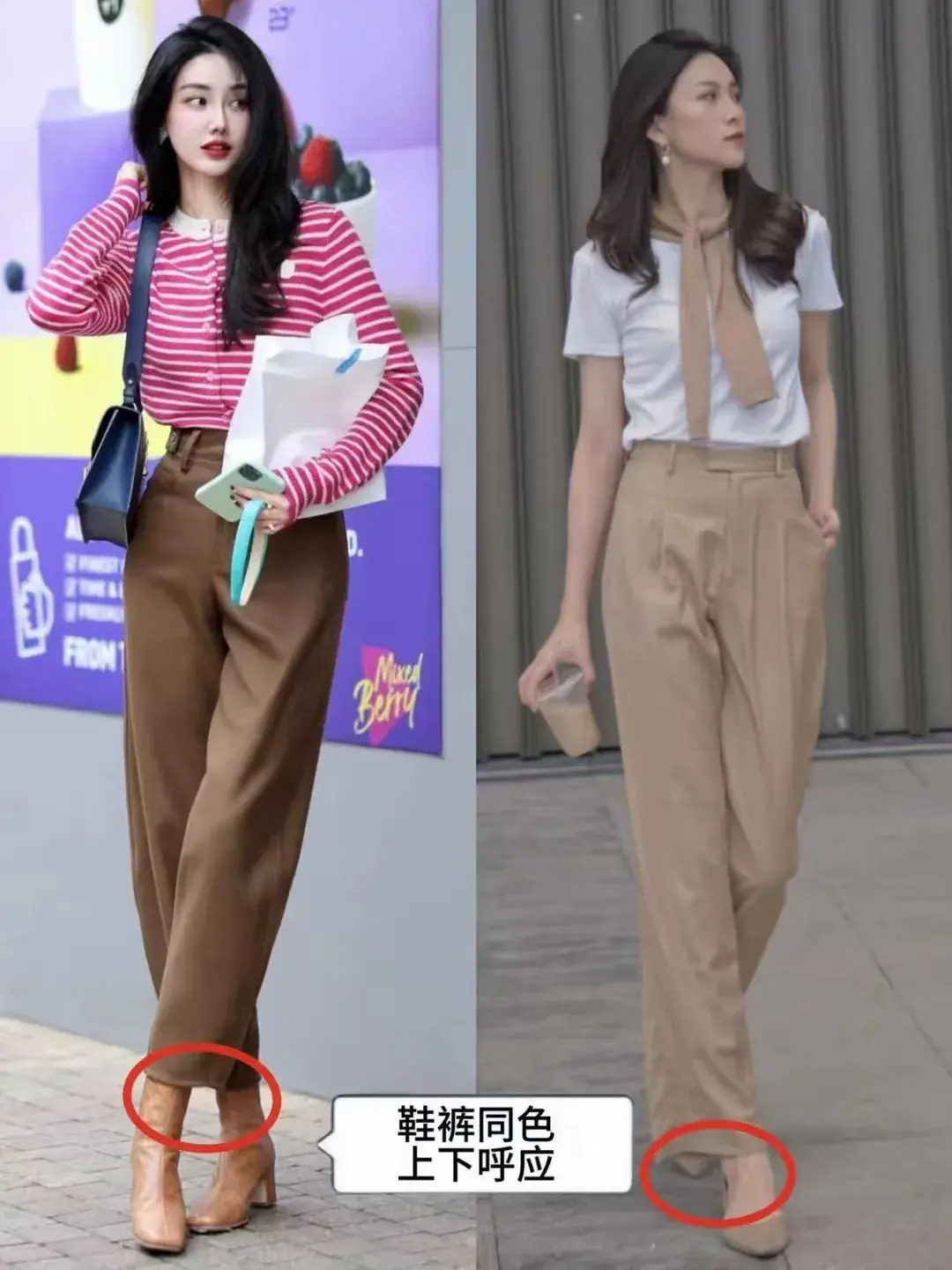 鞋子的选择也是很关键的,例如下面这两位素人博主的穿衣示范,鞋子的颜色和裤子的颜色同色系的形成了上下呼应的效果,这种情况下穿出来的造型会更大气。