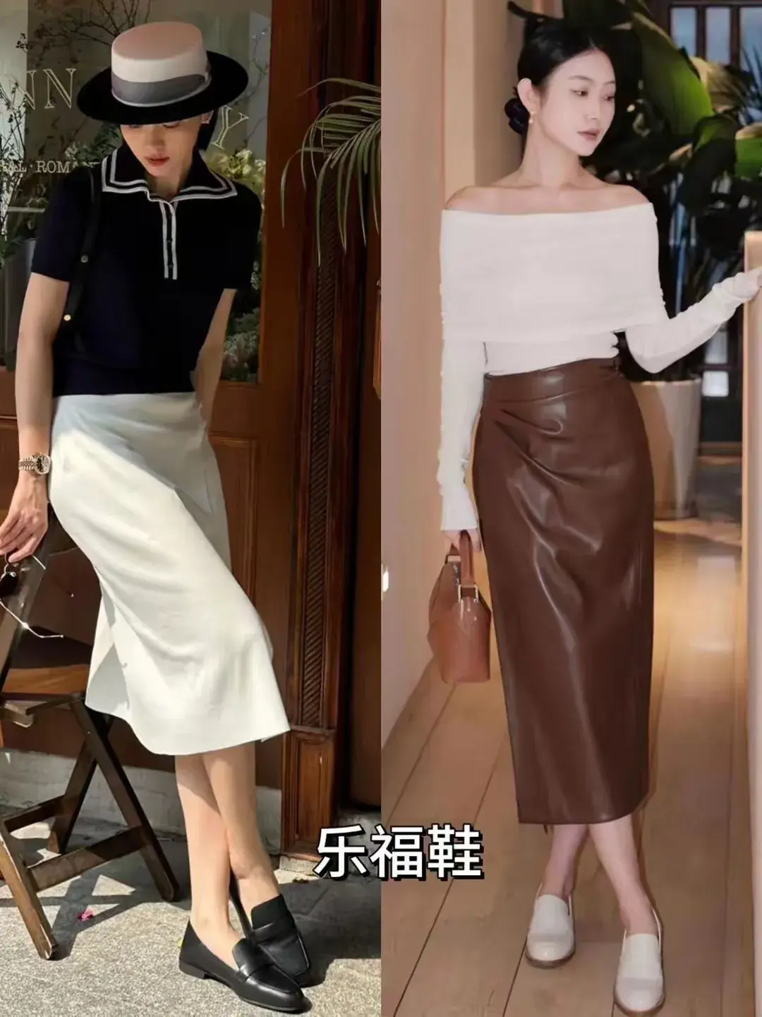 当然,不同的裙子穿出来的效果自然也有很大的区别,例如直筒的半身裙搭配上修身上衣,给人的感觉会更加的大气,脚上踩了一双乐福鞋,通勤又时髦。