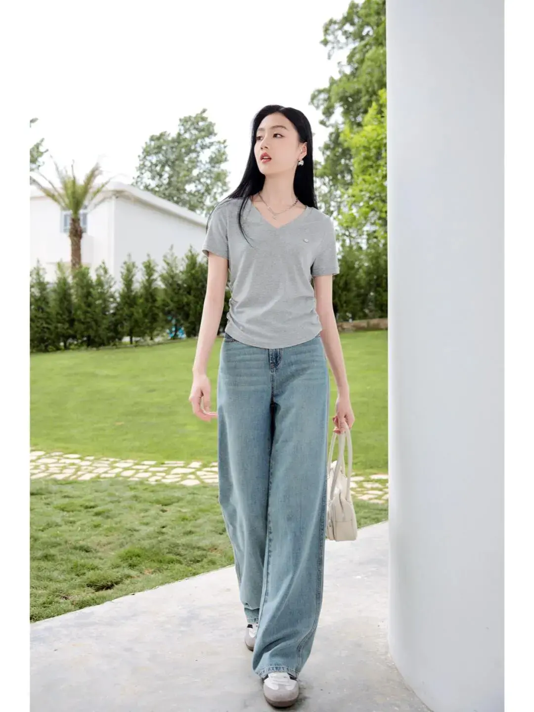 我个人还是蛮推荐下面这位博主的创意示范的,可以选择灰色的V领上衣搭配上牛仔直筒长裤,脚上穿了一双德训鞋,这样的穿衣风格,不管你穿去上班逛街约会还是和闺蜜约下午茶都是很不错的选择,特别是对于我们普通大众来说,可以轻松驾驭。