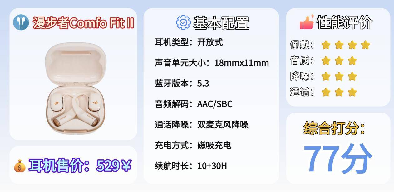 续航方面表现稳定,单次可用约 8 小时,结合充电盒总续航可达 30 小时。快充效率不俗,充电 15 分钟可带来约 2 小时使用时间,外出前临时补电非常实用。缺点在于充电盒体积稍大,携带时占用一定空间。整体来看,Comfo Fit II 是一款针对运动场景和日常通勤的均衡型耳机,佩戴舒适稳固,但在细节音质与降噪表现上仍有改进余地。